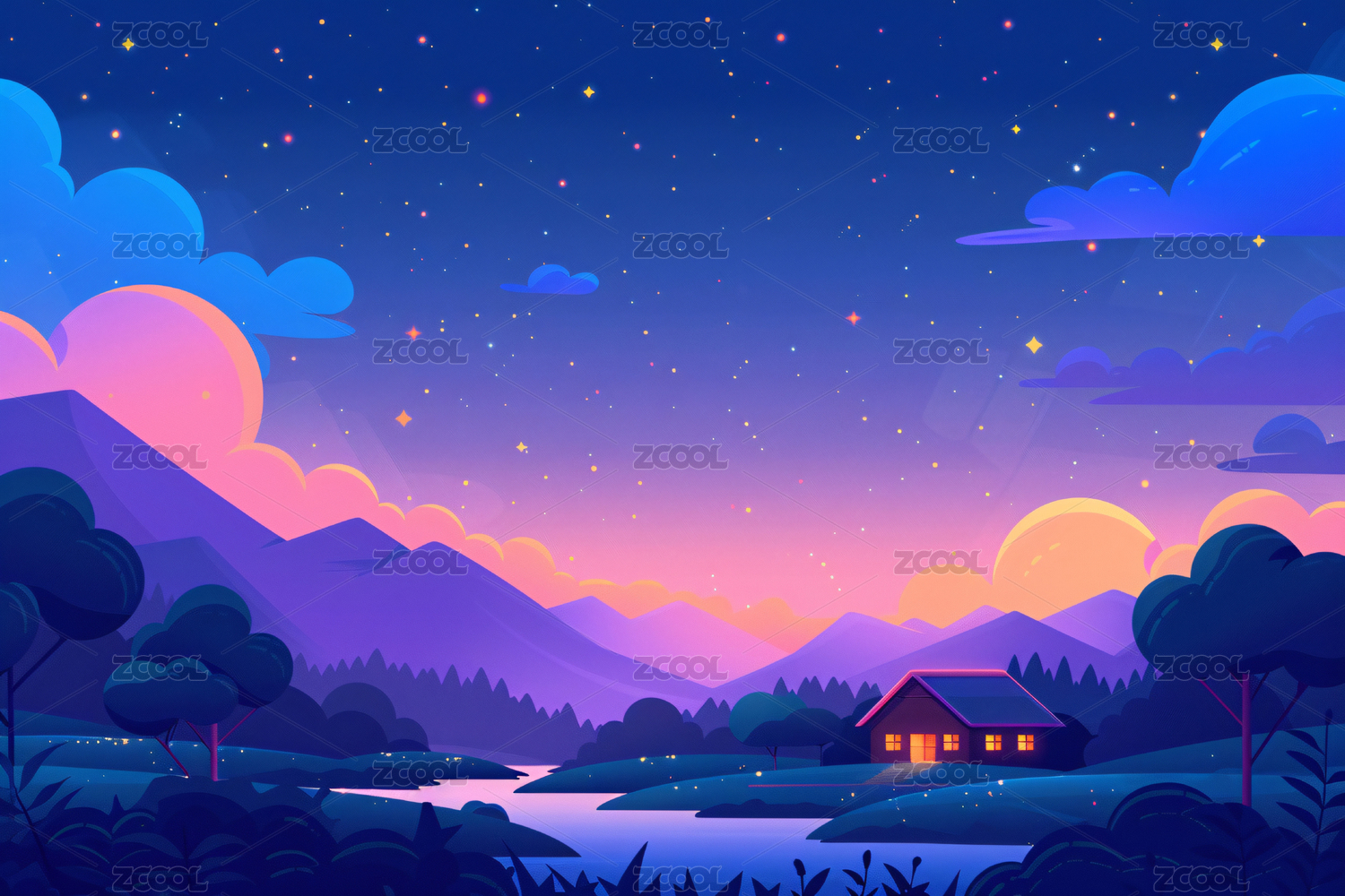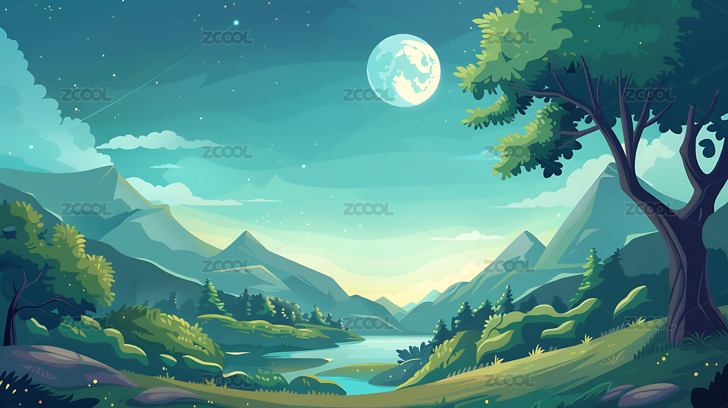 夜间山水风景插画