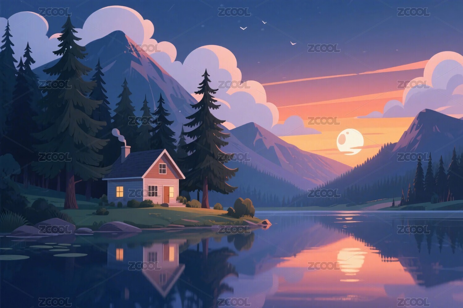 山水湖畔小木屋夕阳景