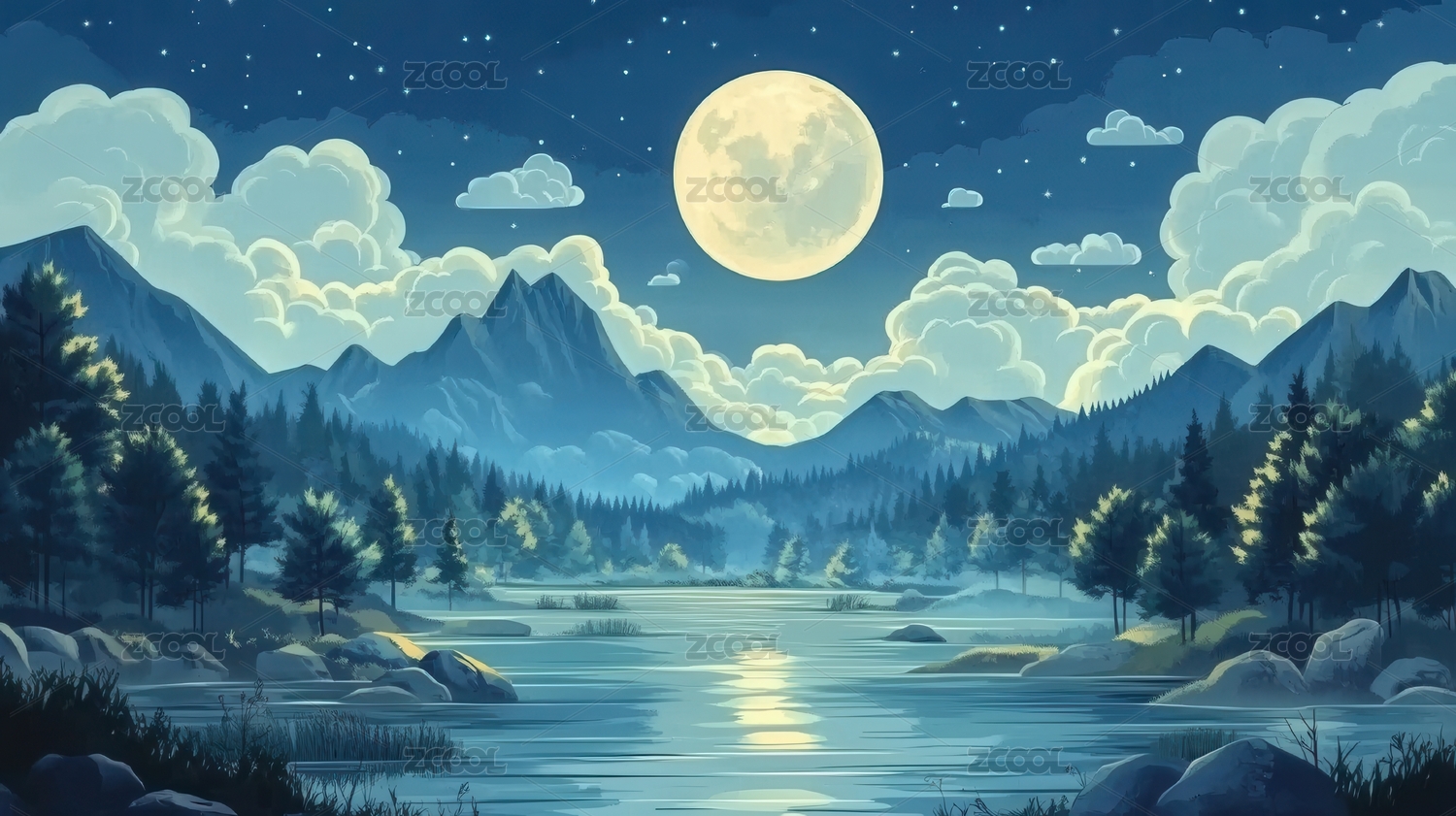 森林湖泊夜景插画
