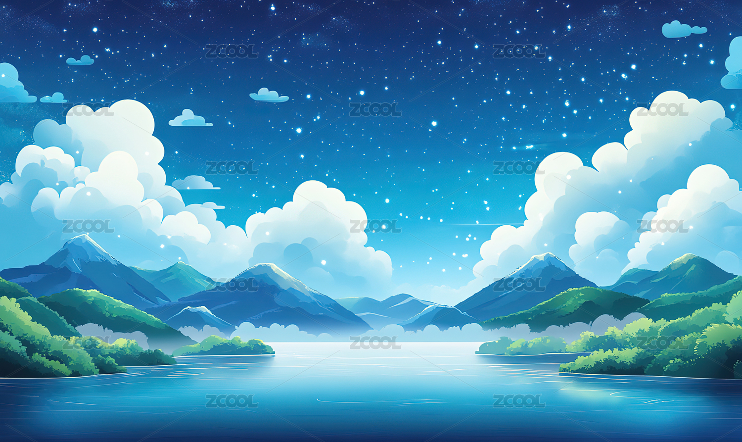 湖景星空森林插画