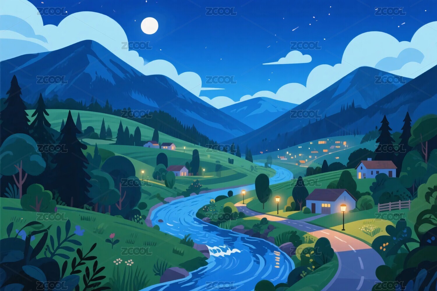 夜间山水田园插画