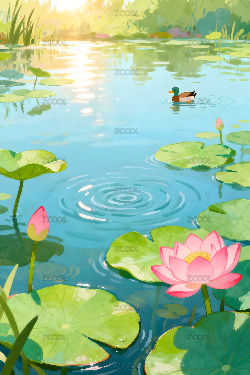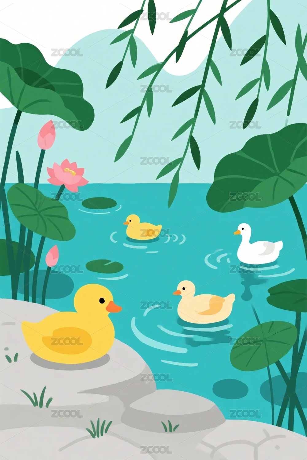 鸭子,荷花,荷叶,池塘,柳枝,插画,自然,风景,水面,花朵