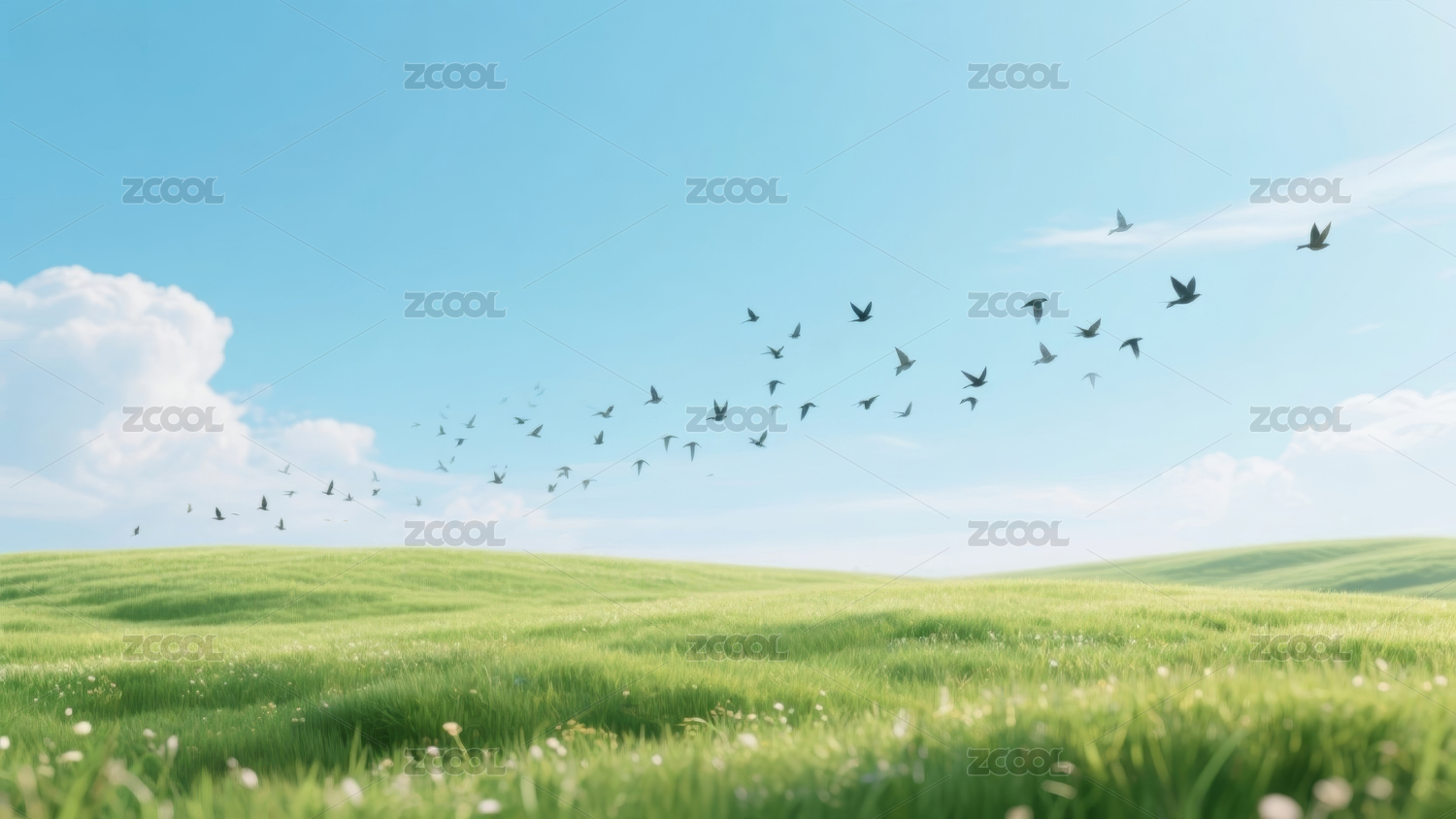 草地,蝴蝶,飞鸟,花朵,自然,风景,插画,清新,唯美,春日