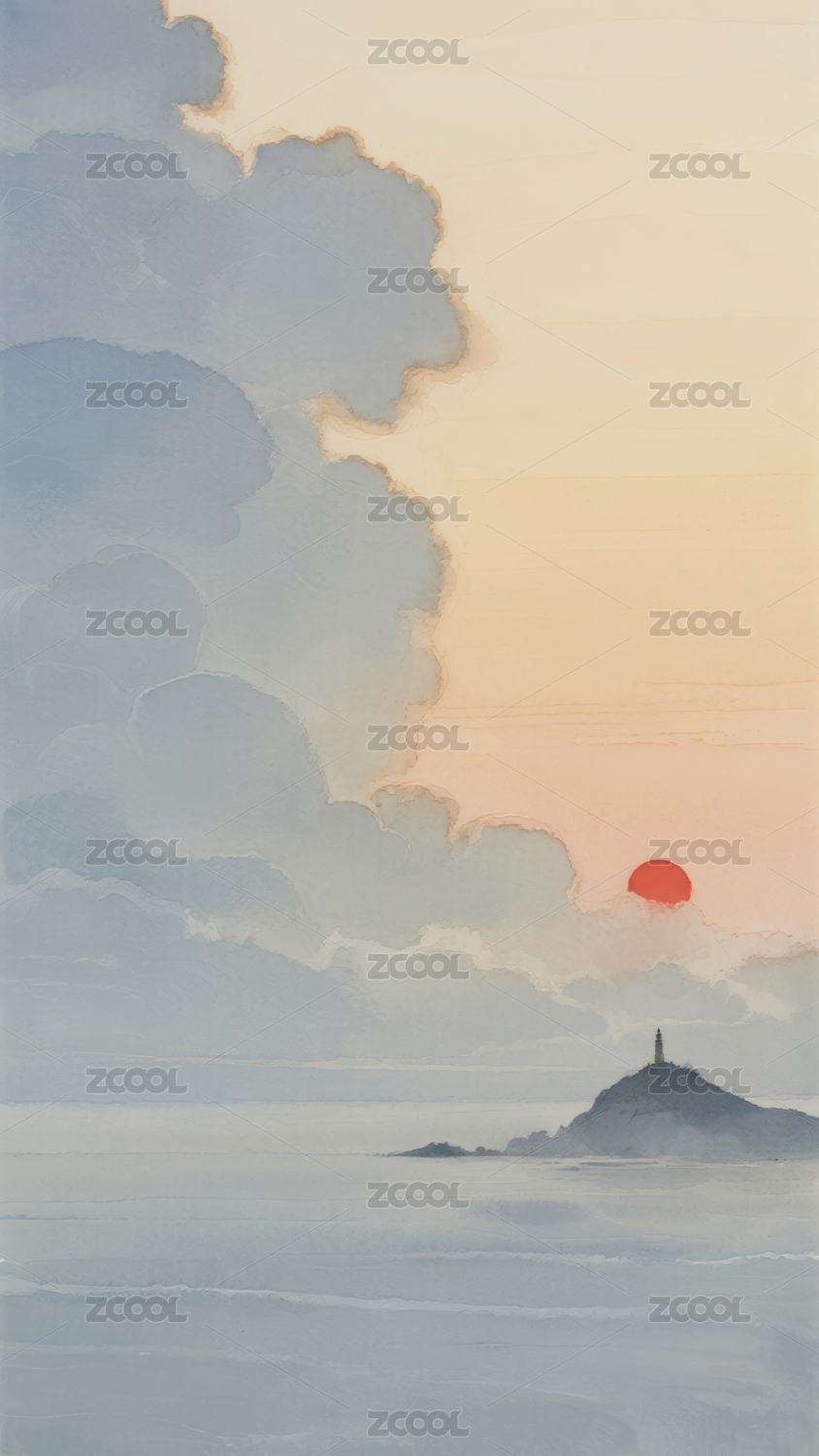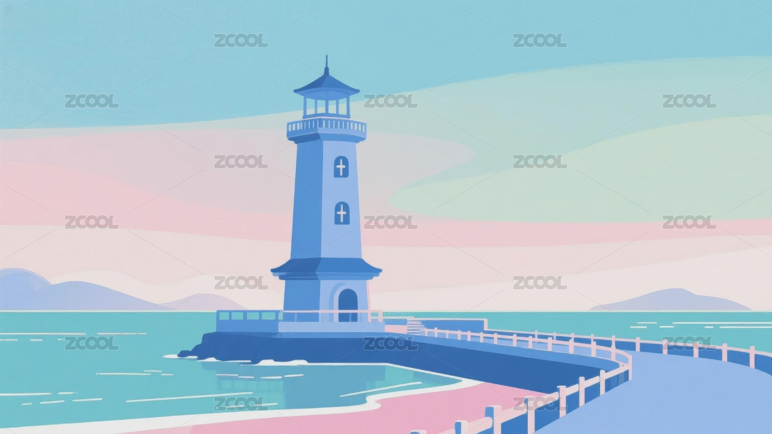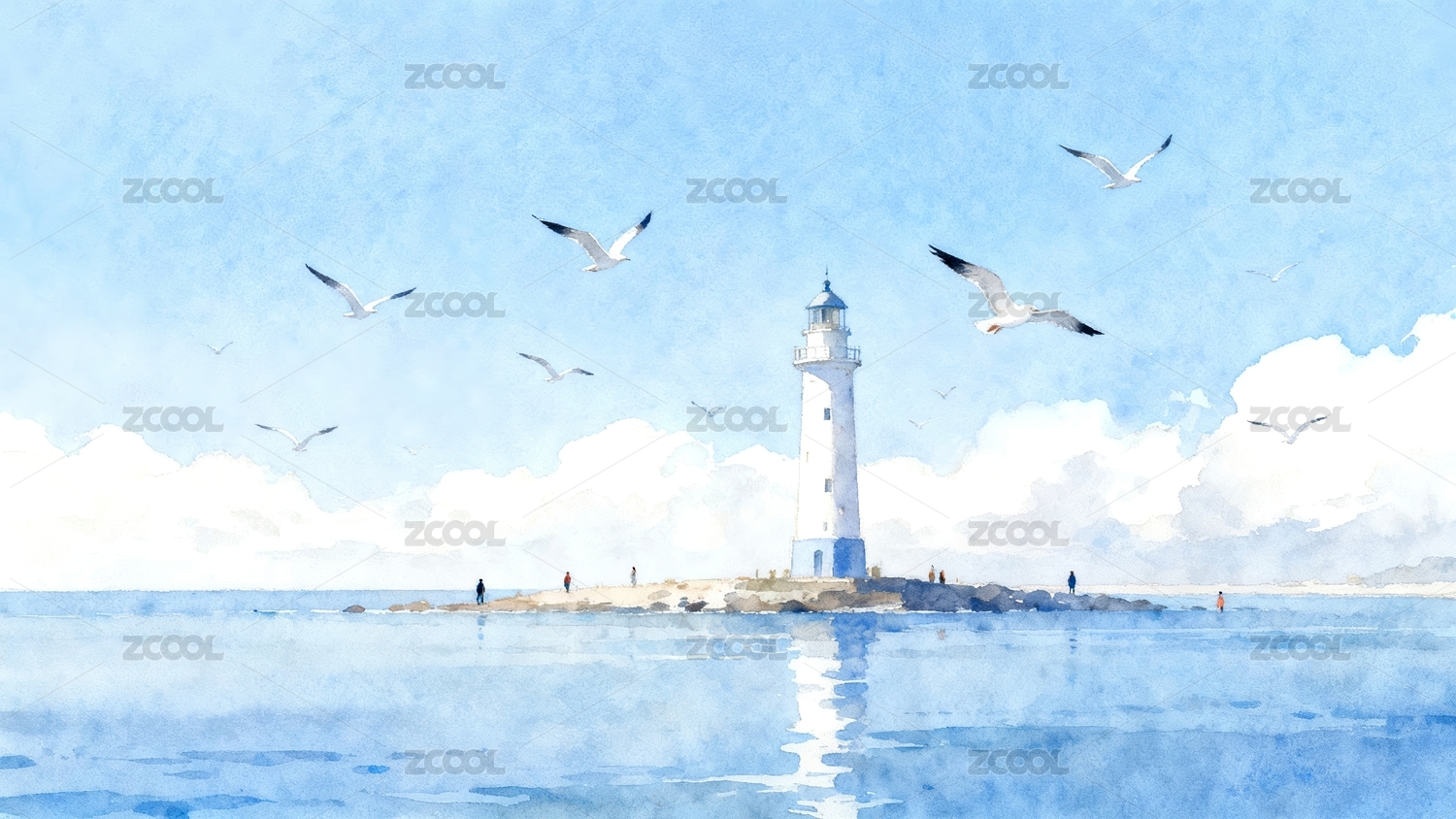 海 北海 灯塔 海阔天空 海岸线 礁石 海浪 水彩
