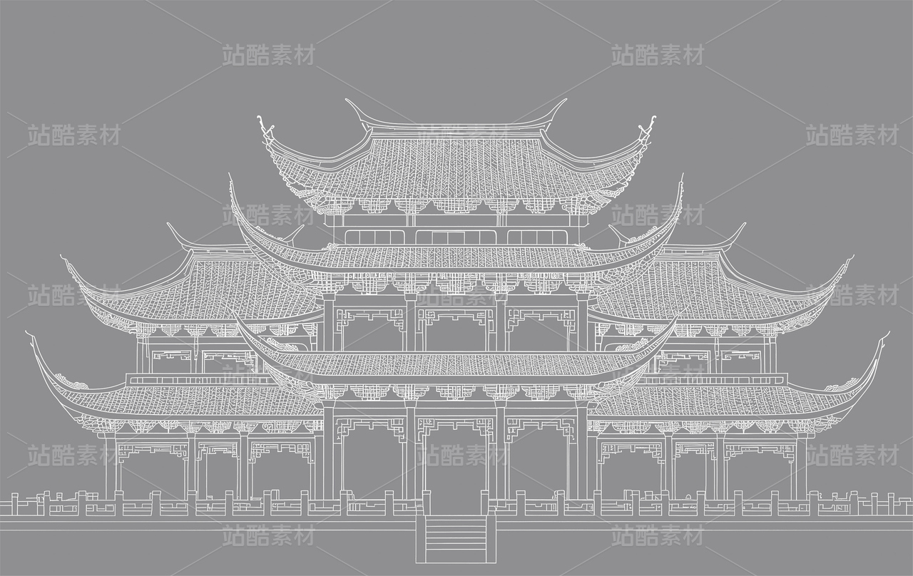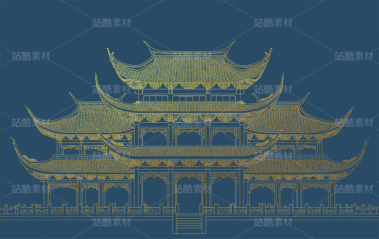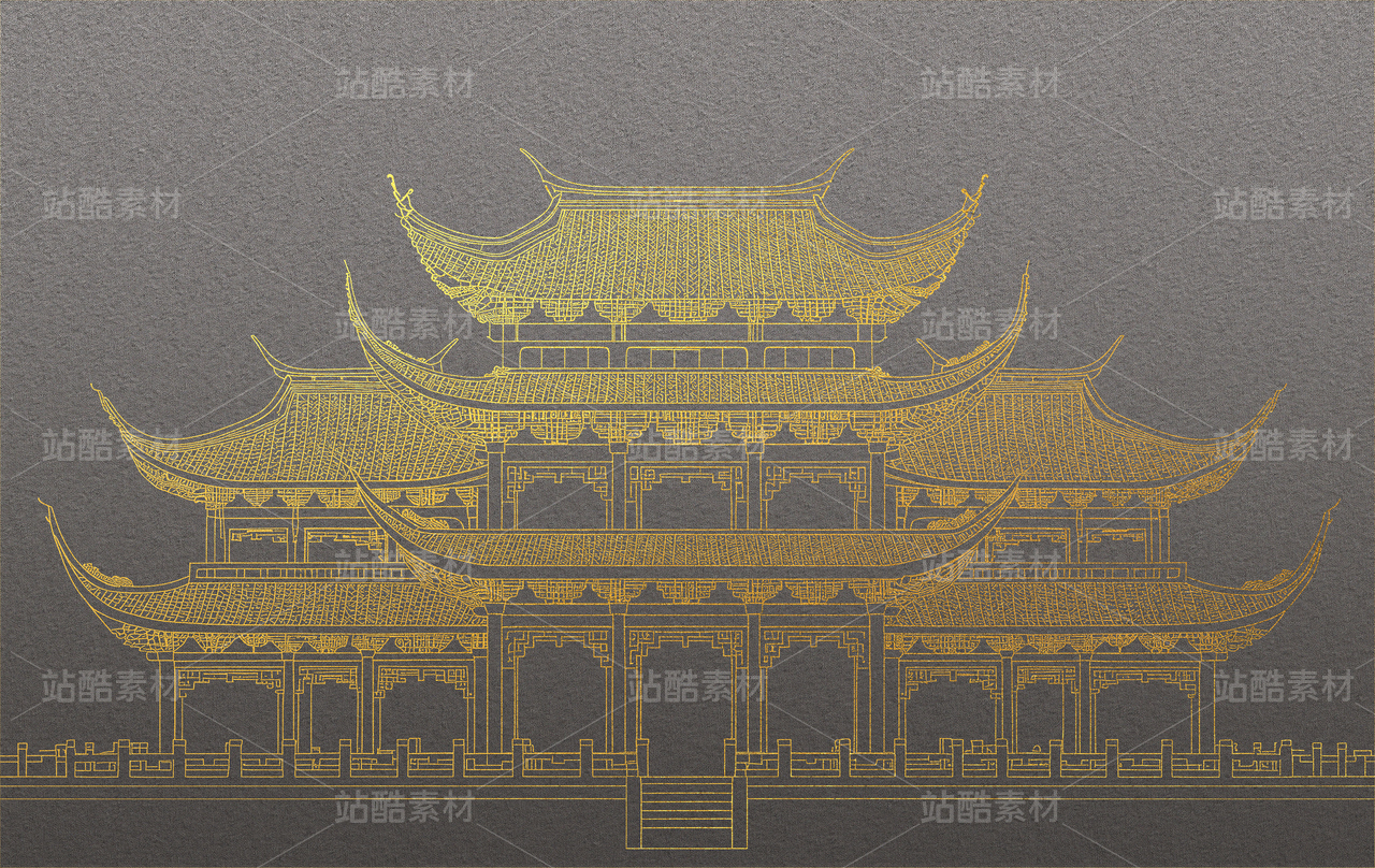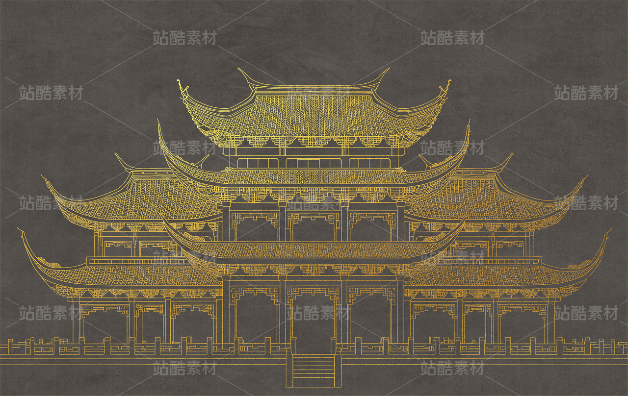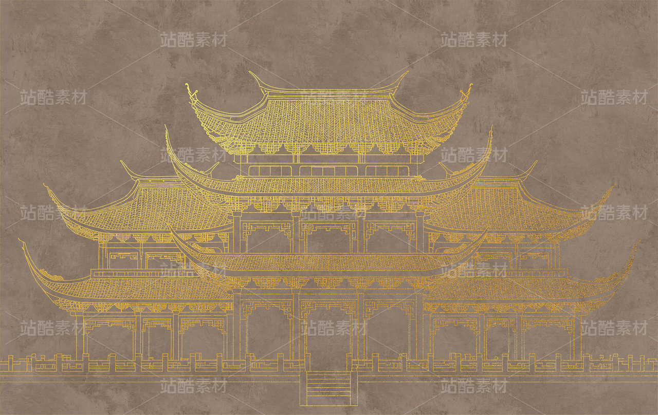 新中式国风亭台楼阁建筑工装背景墙壁画