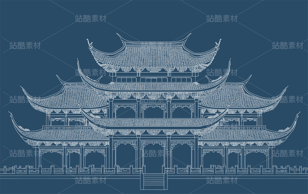新款高清蓝灰楼阁新中式山水工装背景墙00