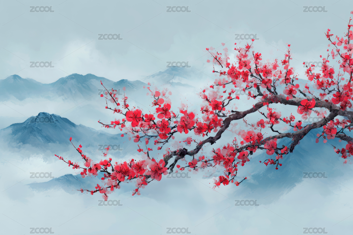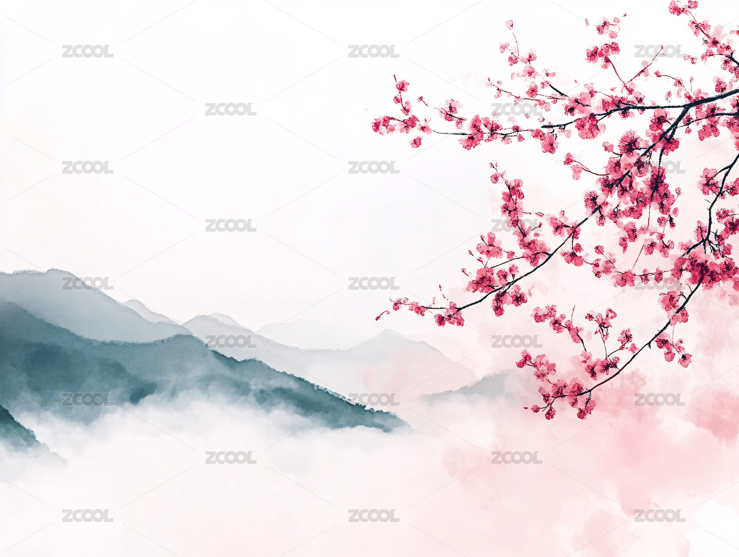 水墨风远山梅花树枝