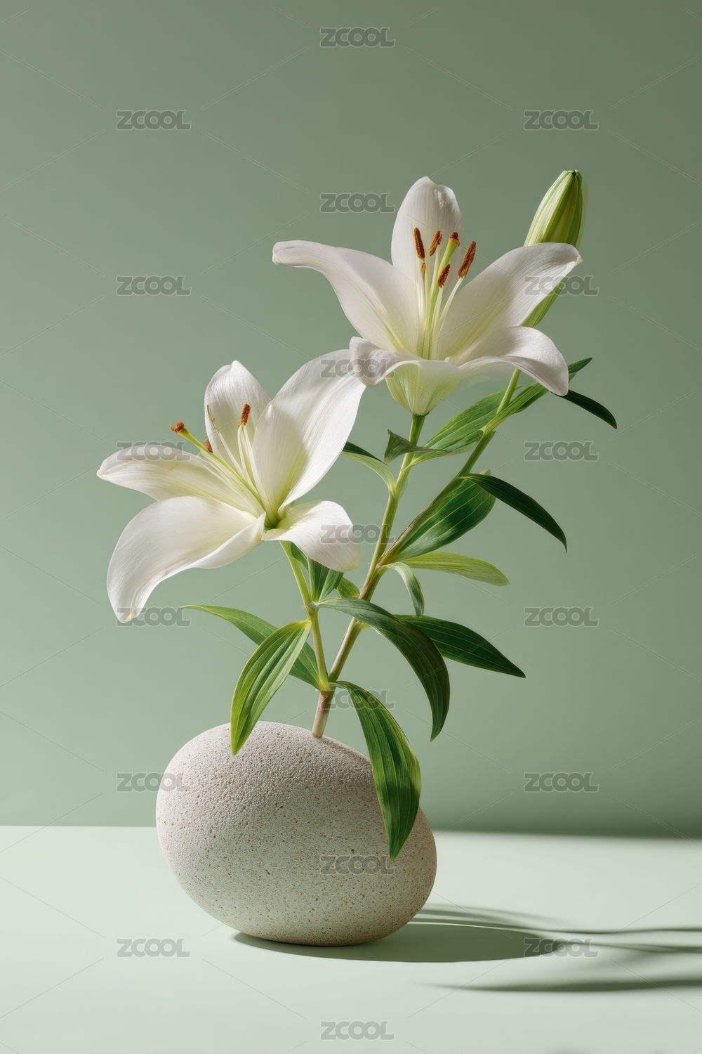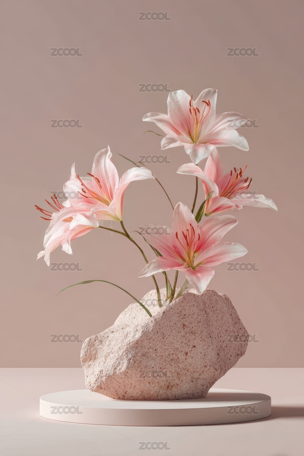 淡粉色百合花与天然石块的静物艺术