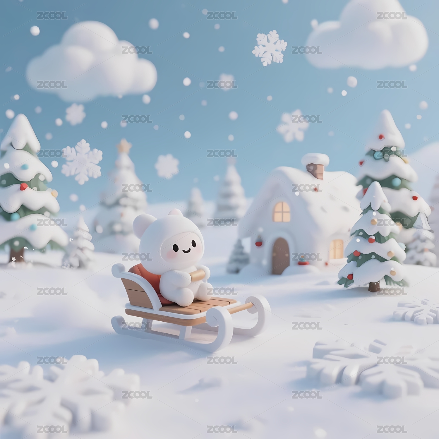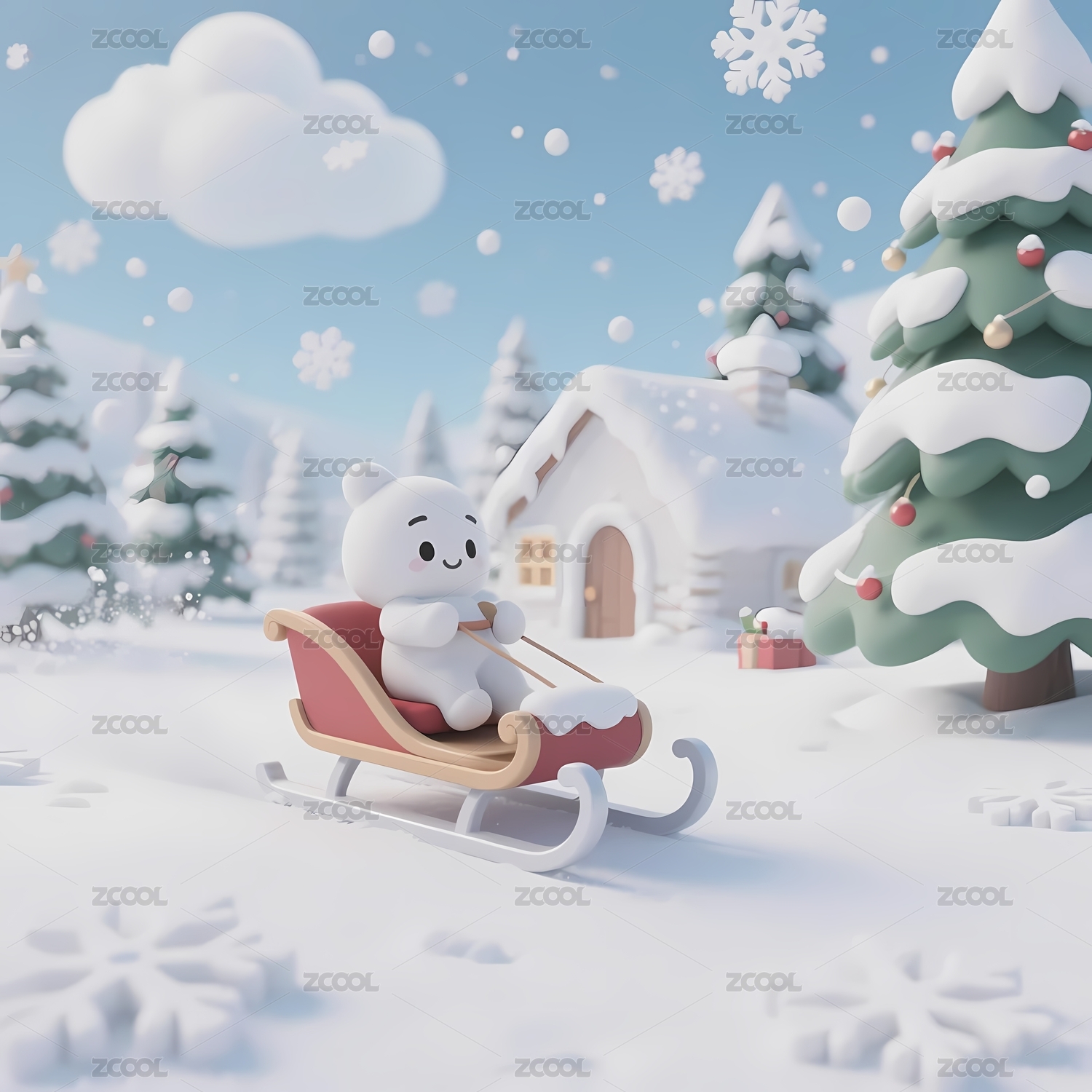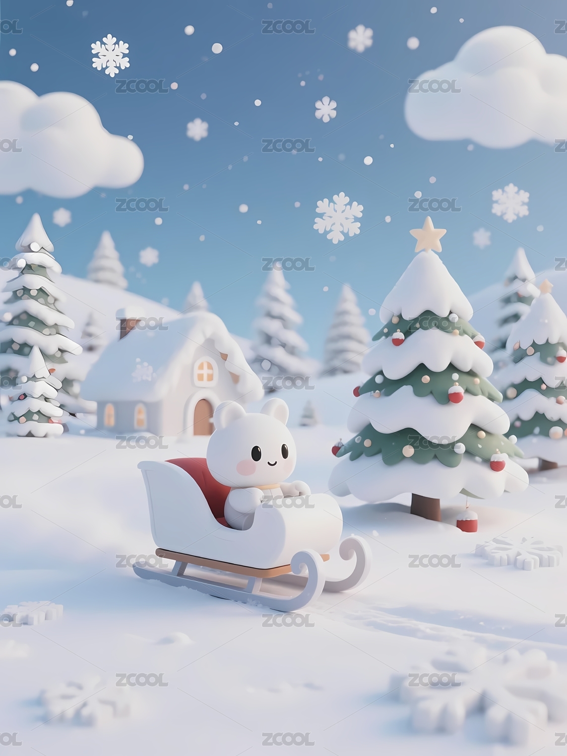 蓝天,白云,灯光,梦幻,场景,小熊,雪橇,圣诞树,雪地,房屋