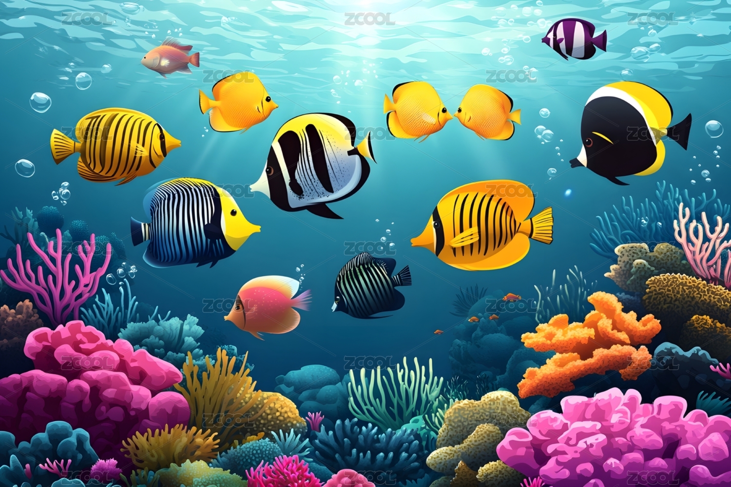 鱼群,珊瑚,彩色,卡通,插画,模板,海草,气泡,海底,海洋
