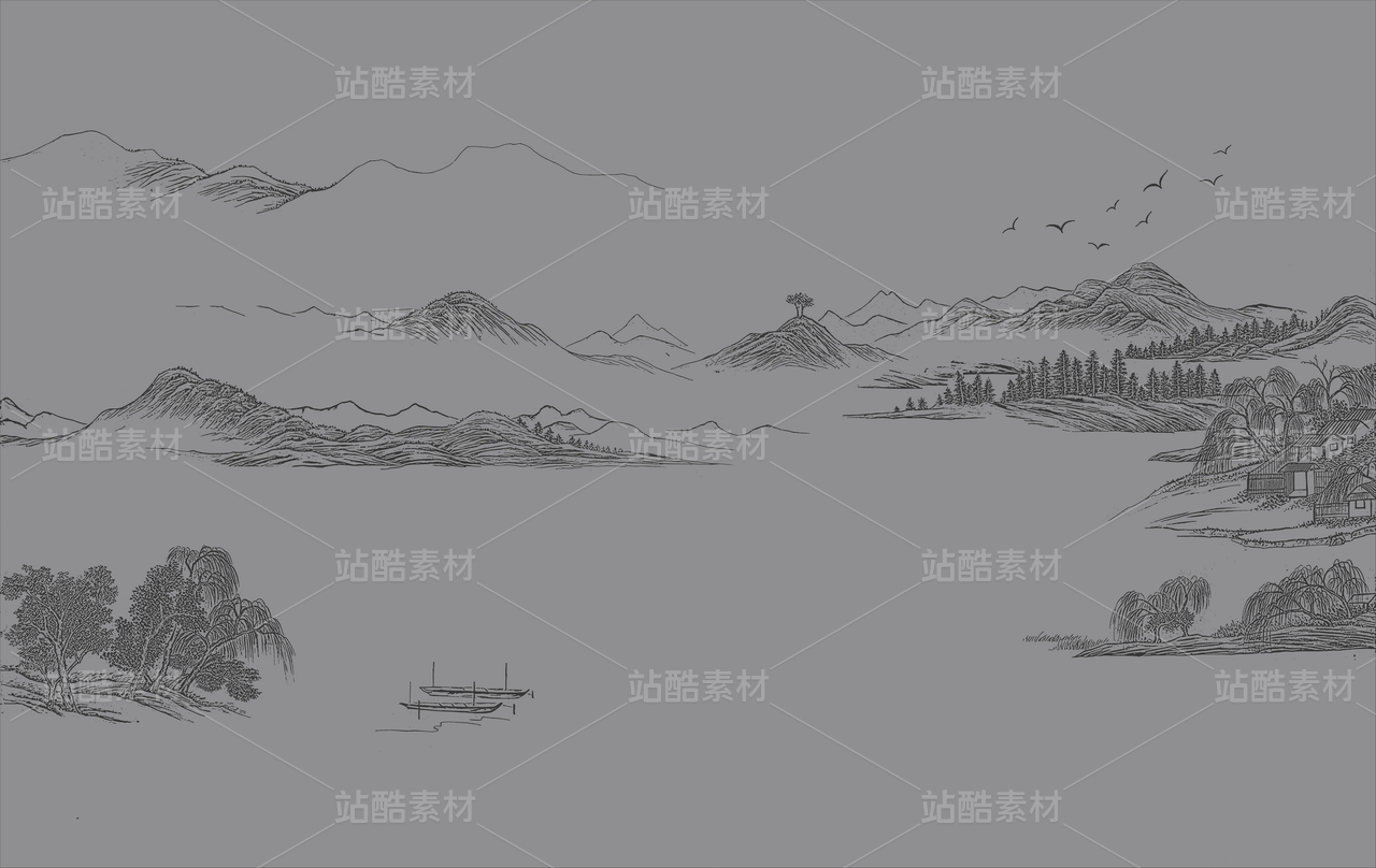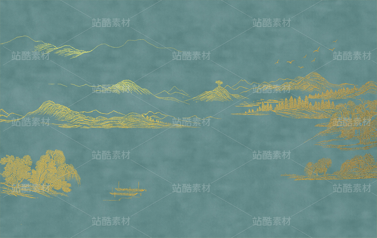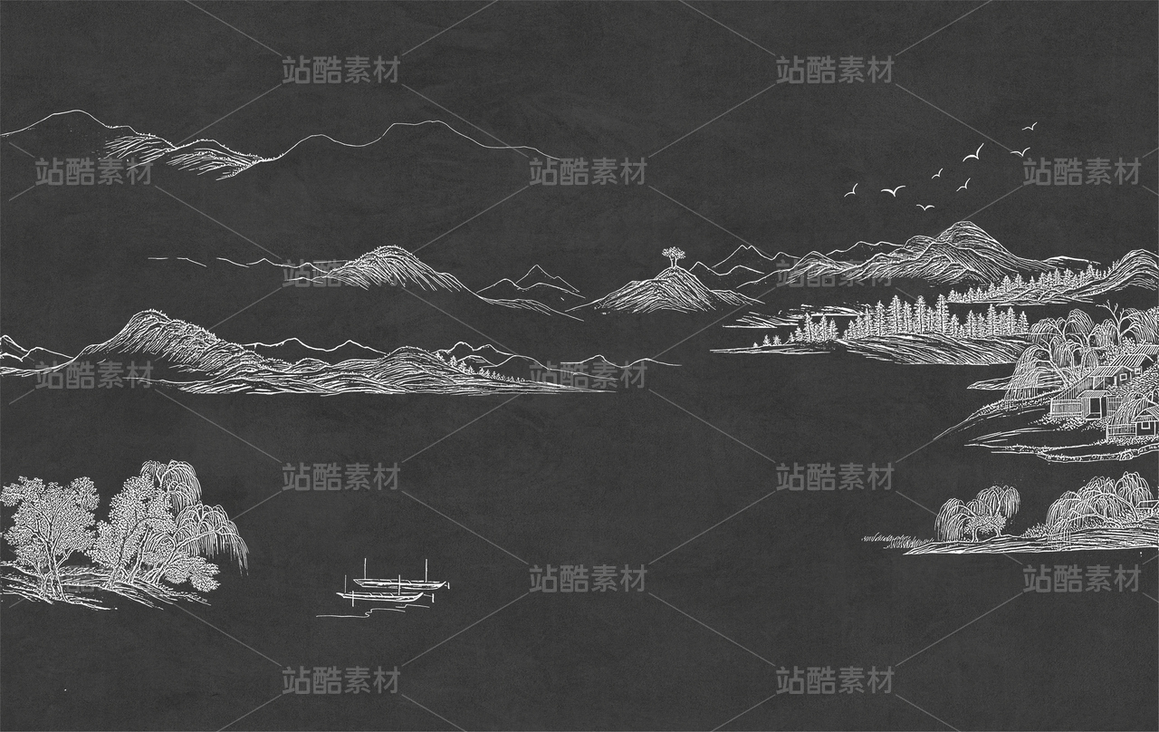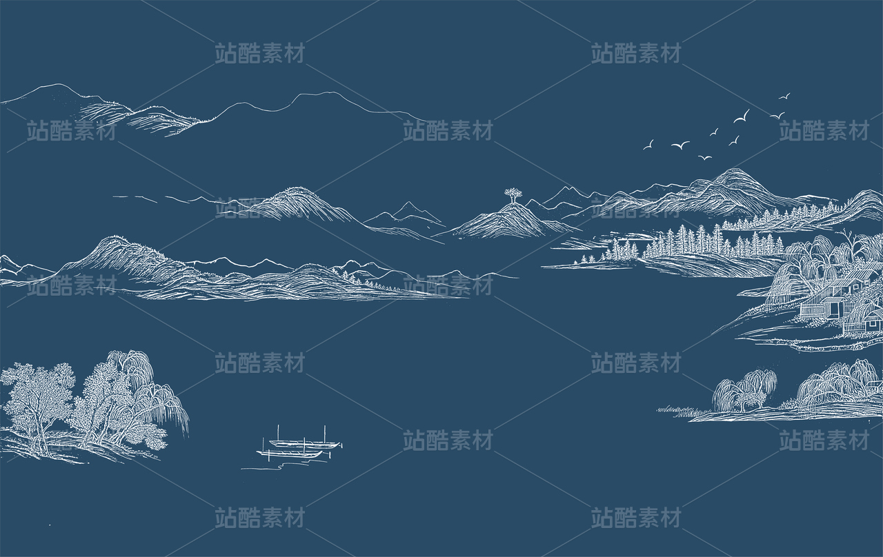 新款高清蓝灰楼阁新中式山水工装背景墙04