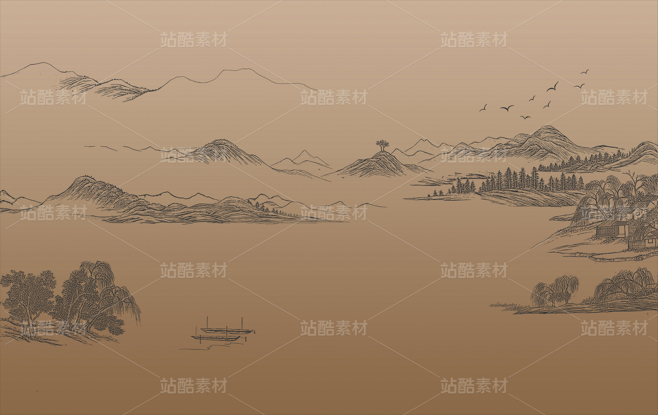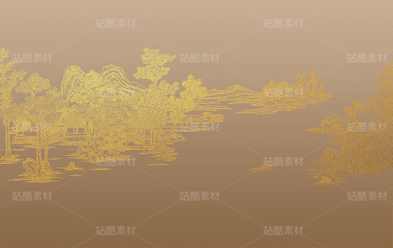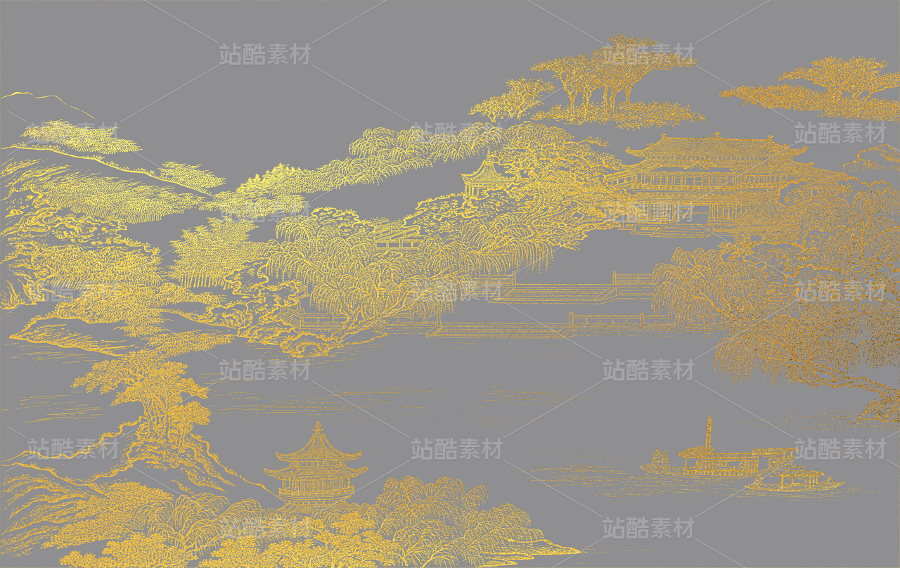 新中式国风亭台楼阁建筑工装背景墙壁画