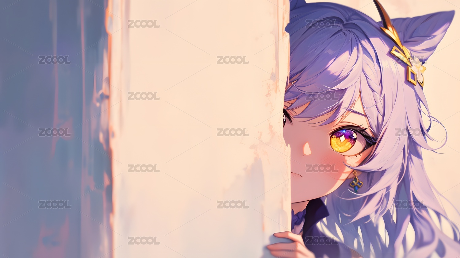 紫发猫耳黄瞳女孩探头的二次元少女动漫插画