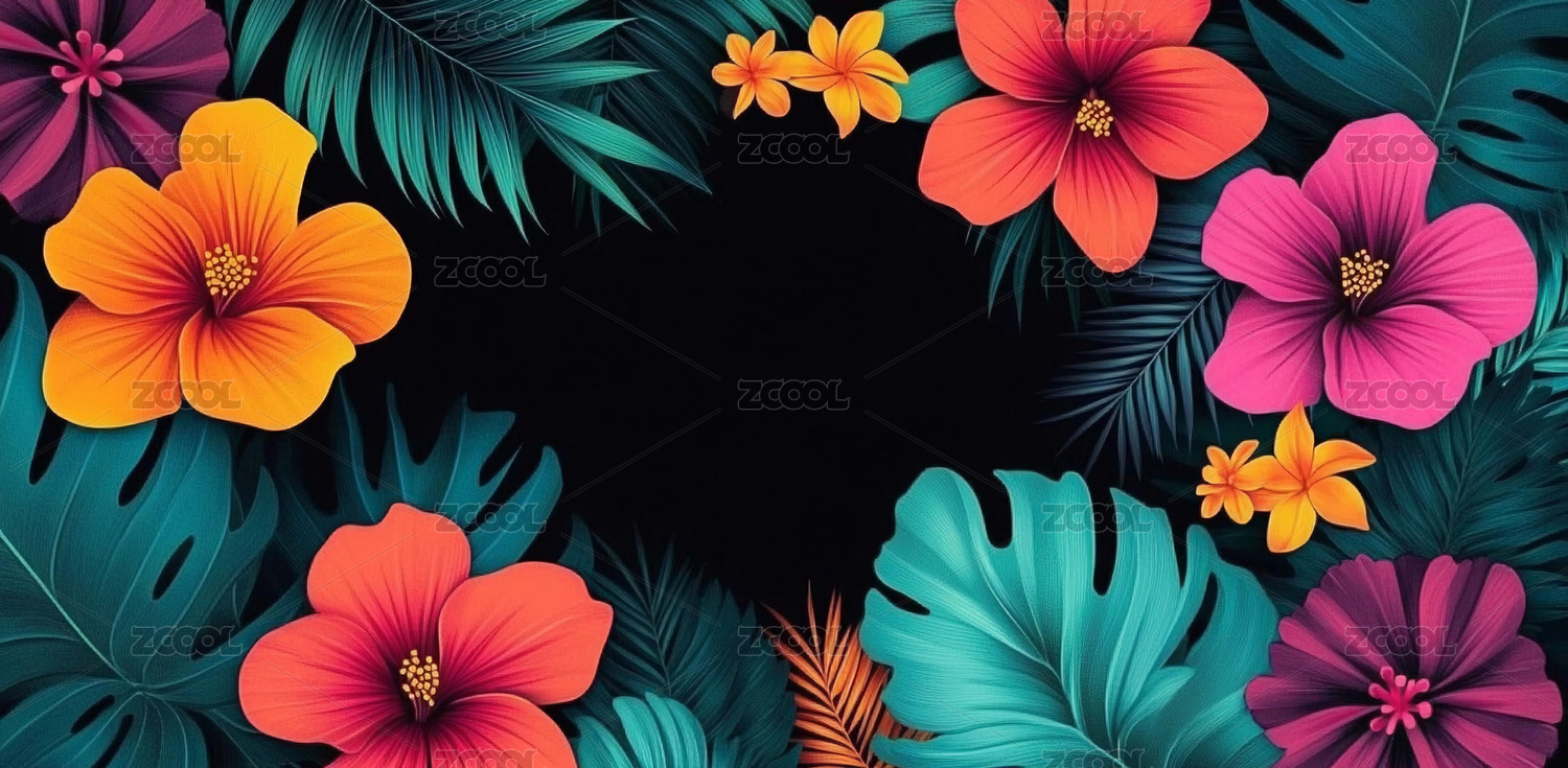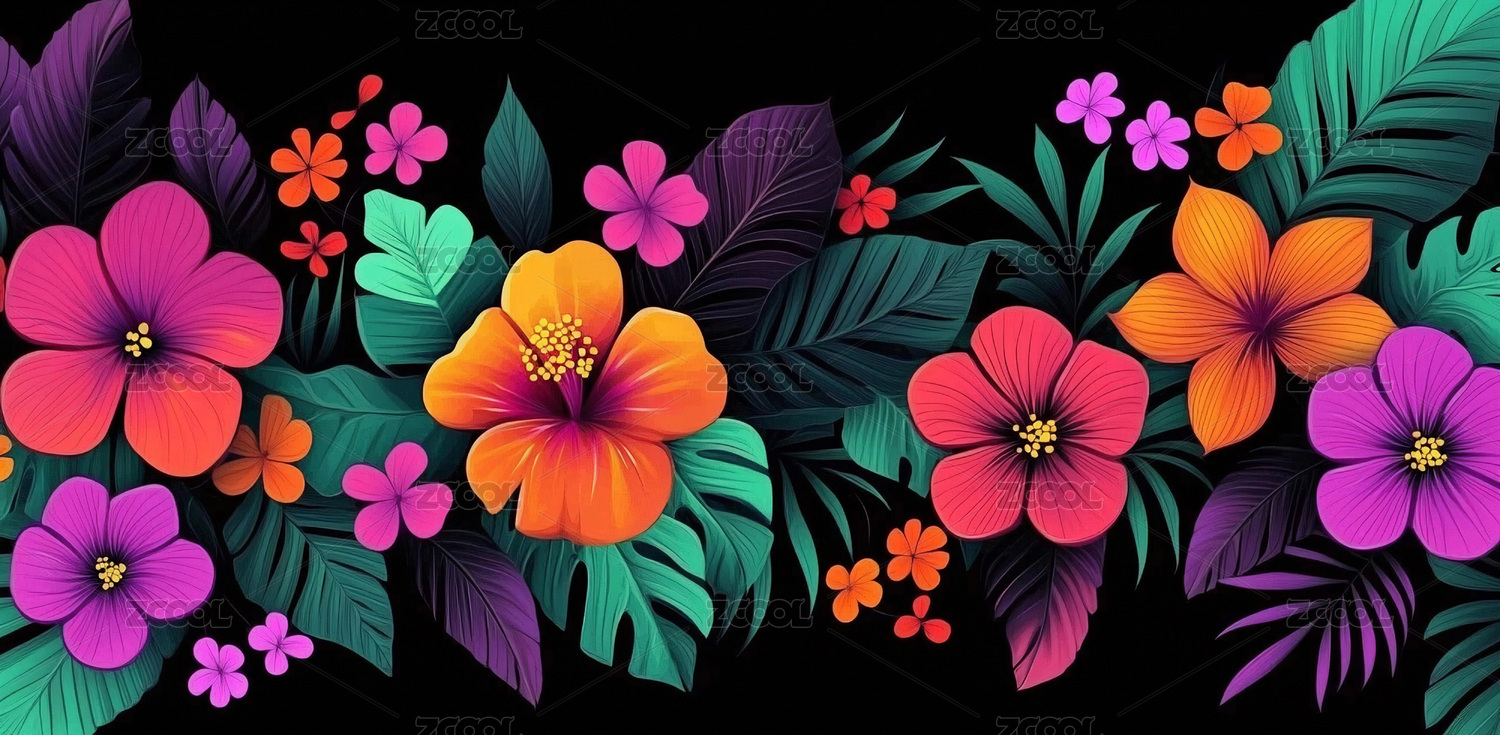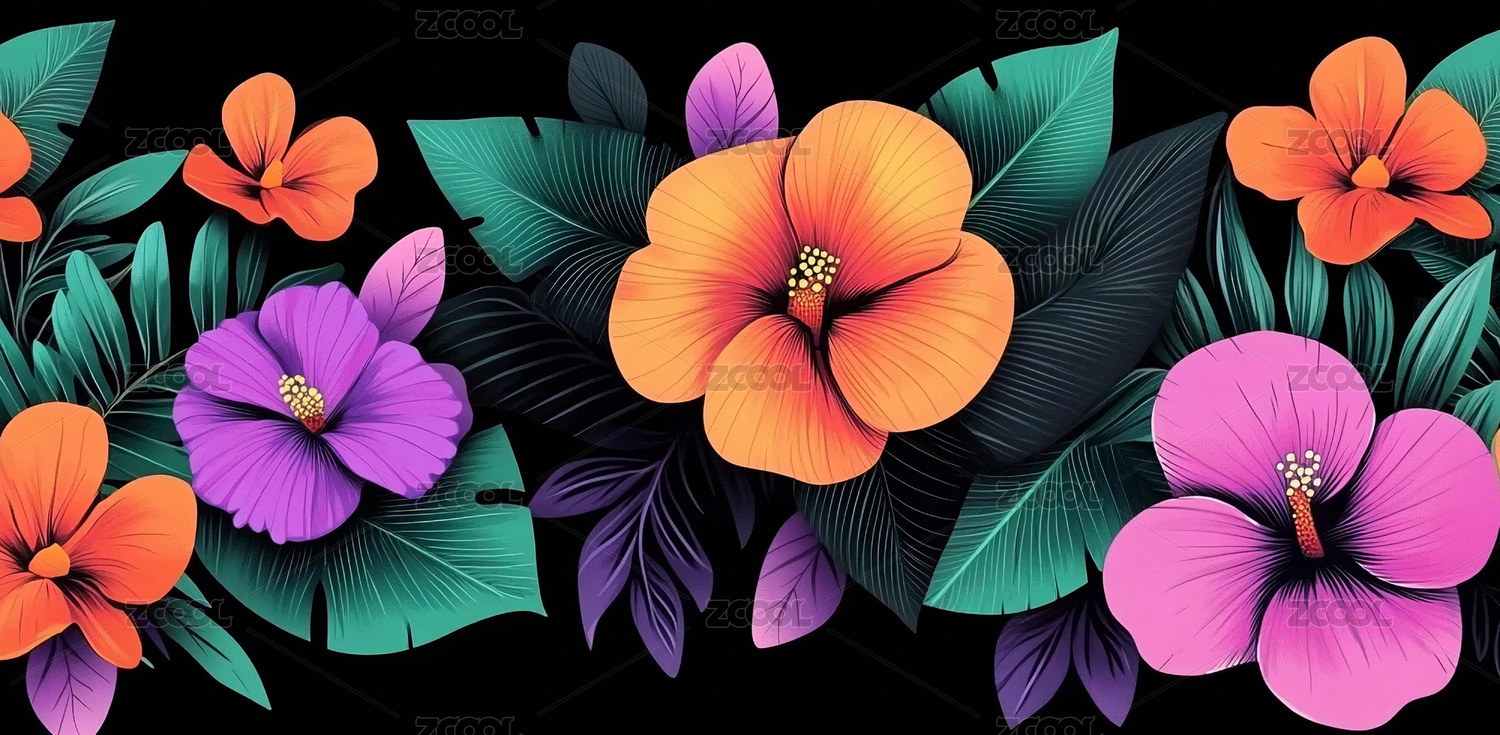 热带花卉与绿叶的鲜艳图案