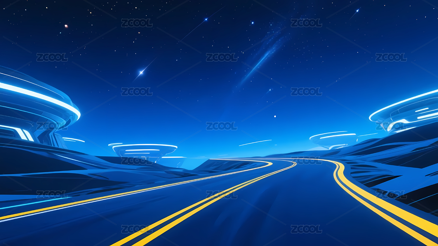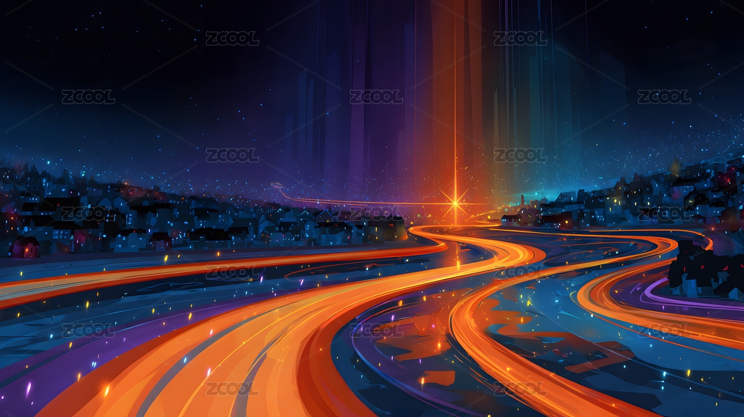 星光下色彩斑斓道路的梦幻科幻手绘风景插画