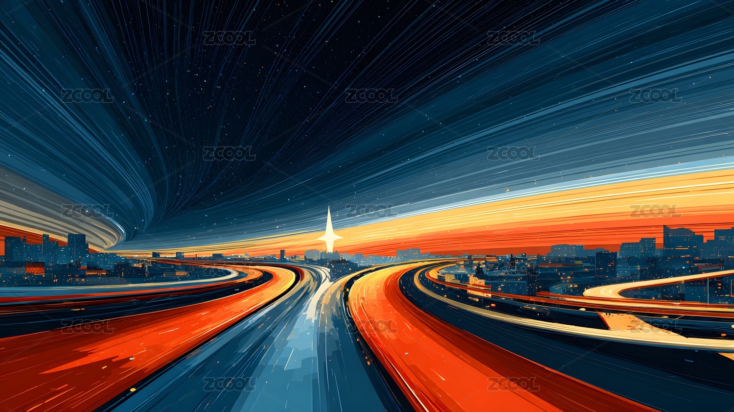 未来都市黄昏车轨光影与建筑夜景插画