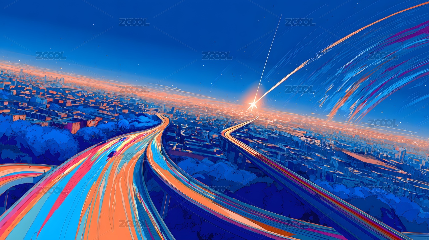 夜景下霓虹色彩城市立交桥俯瞰未来科幻插画