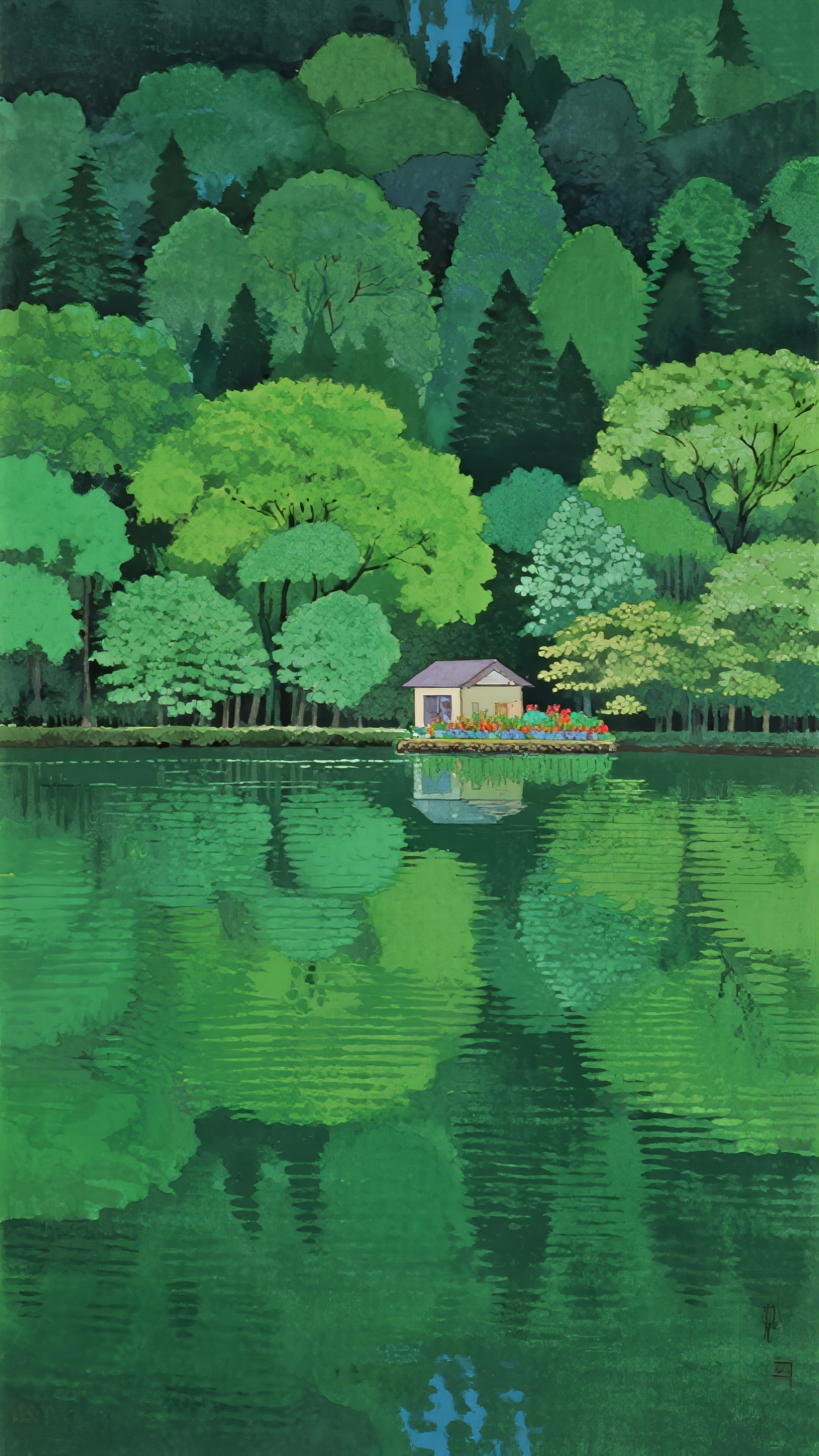 湖畔小屋与绿树倒影