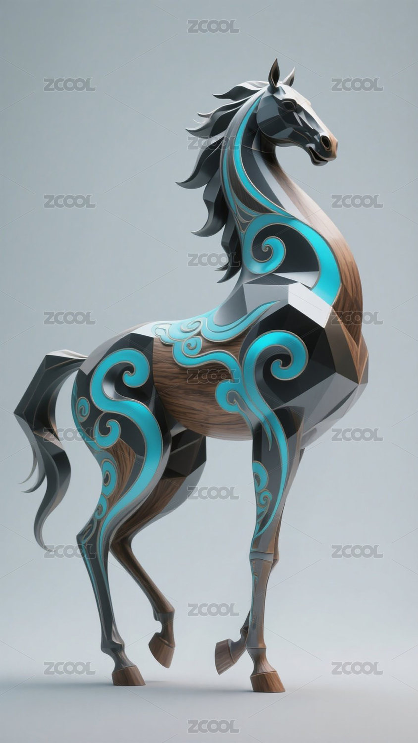 马,雕像,木纹,3D,蓝色,几何,棕色,旋涡,祥云,光滑