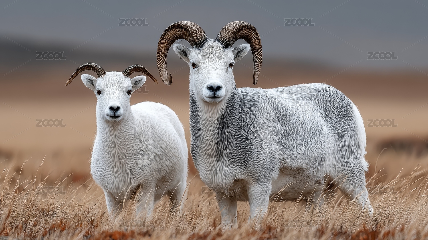 两只长着大角的山羊站在枯黄草地上