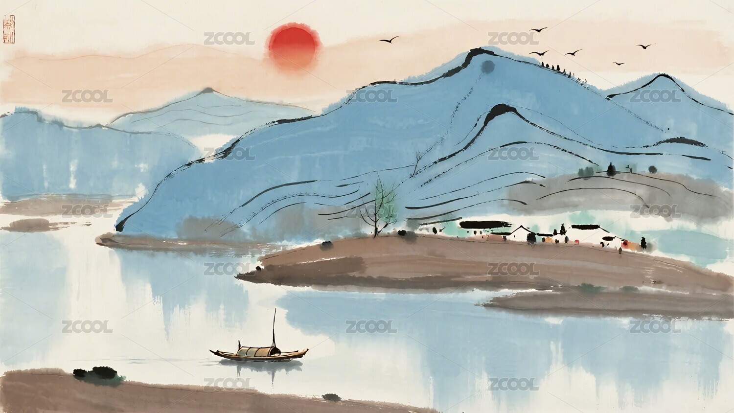 水墨风格江上孤舟图景
