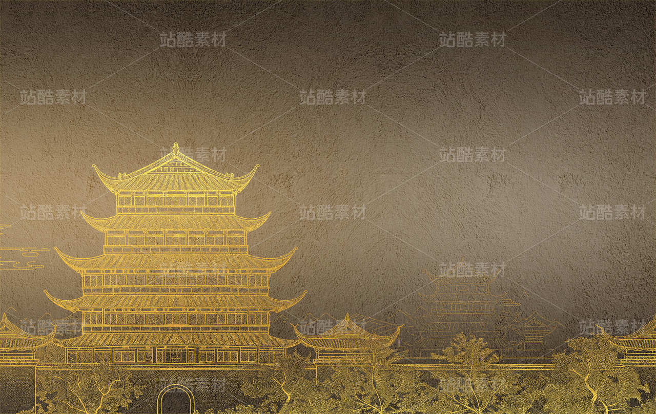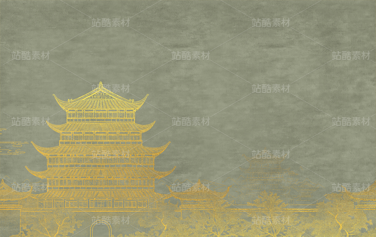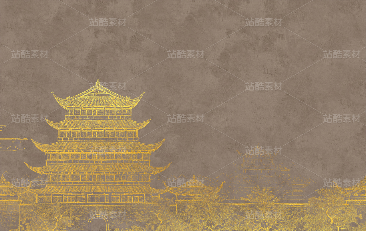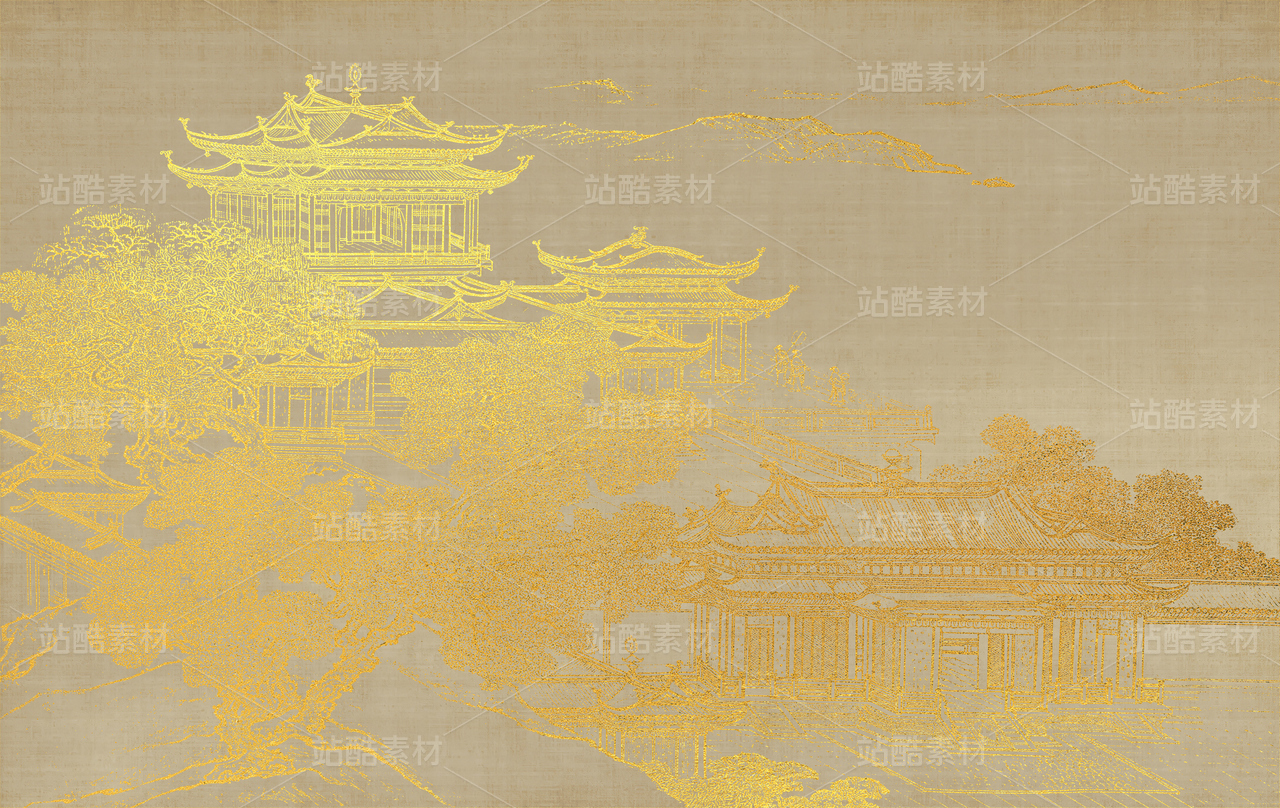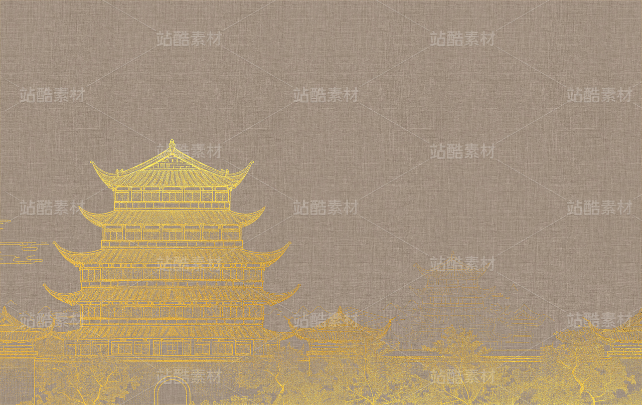 新款高清麻布纹楼阁新中式山水工装背景墙00