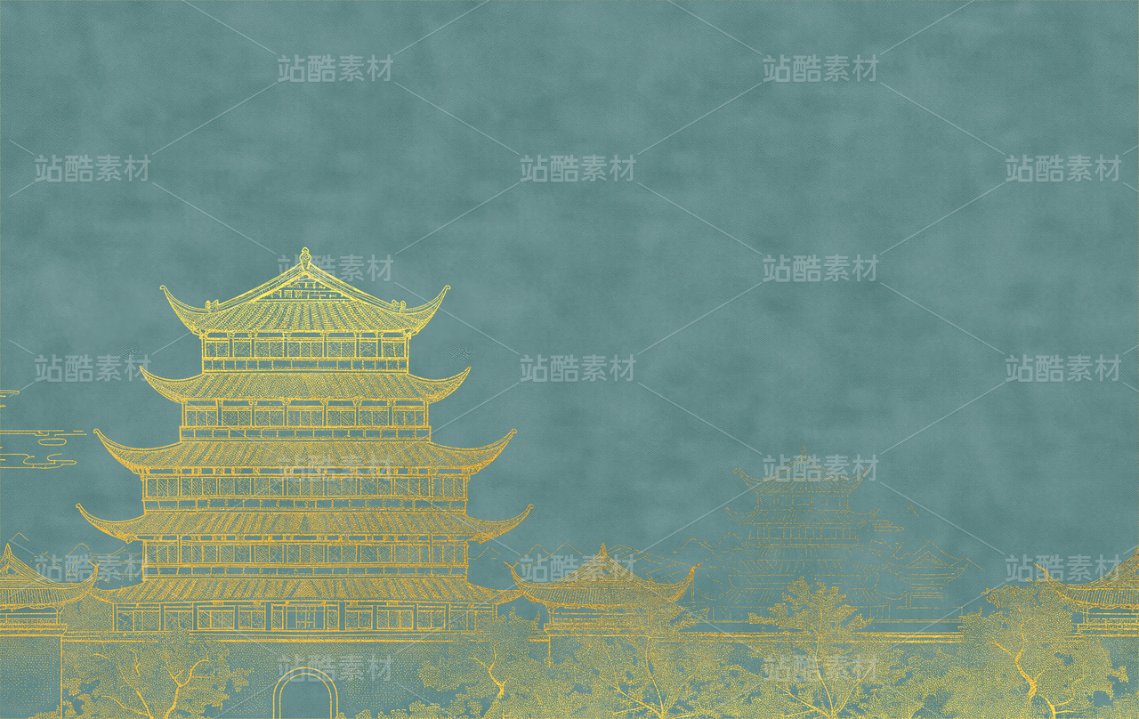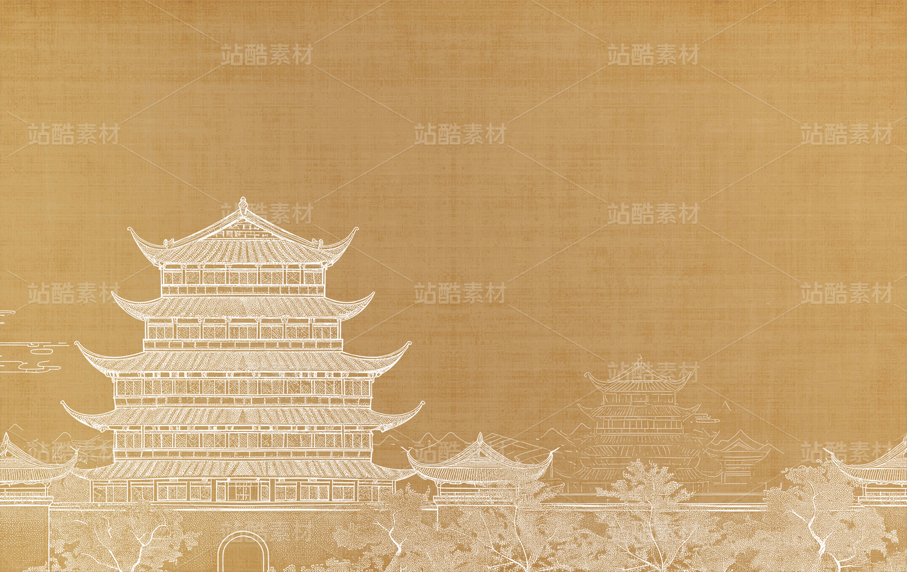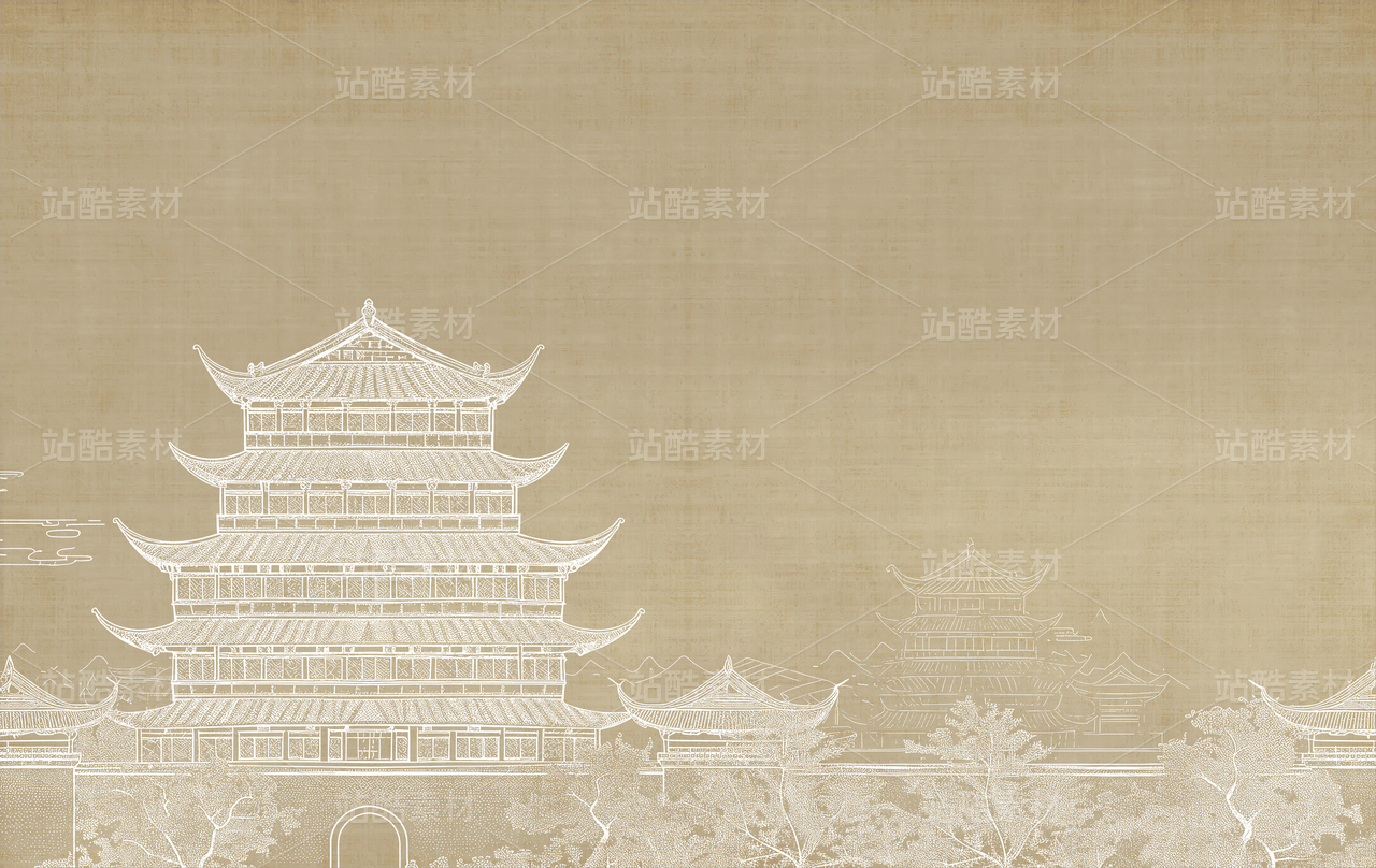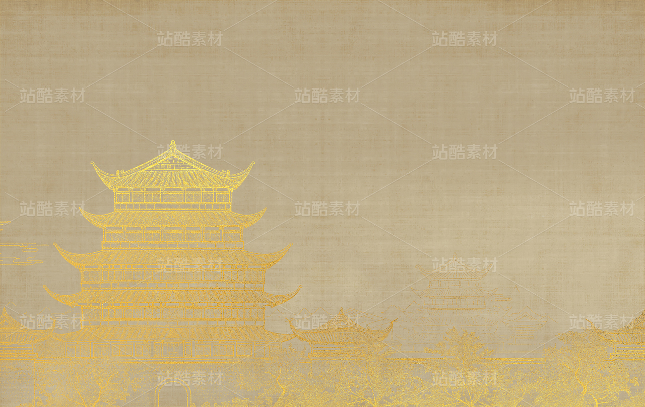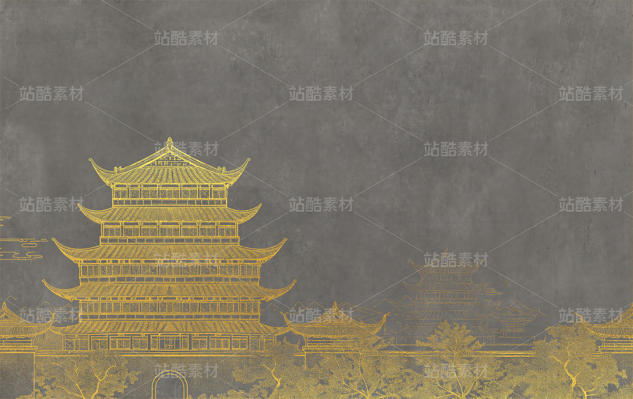 新款高清麻布纹楼阁新中式山水工装背景墙00