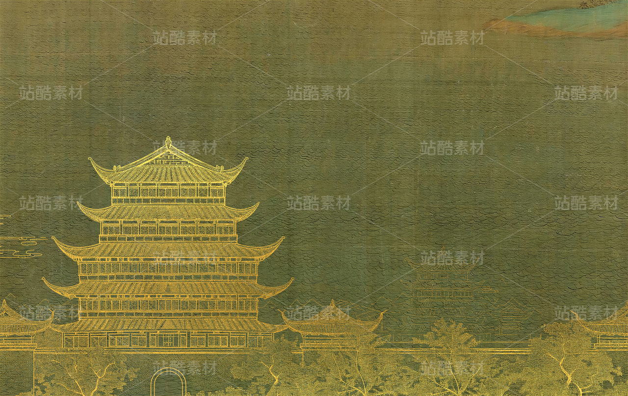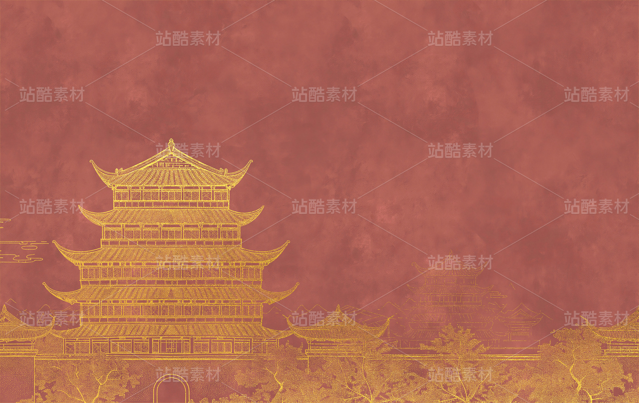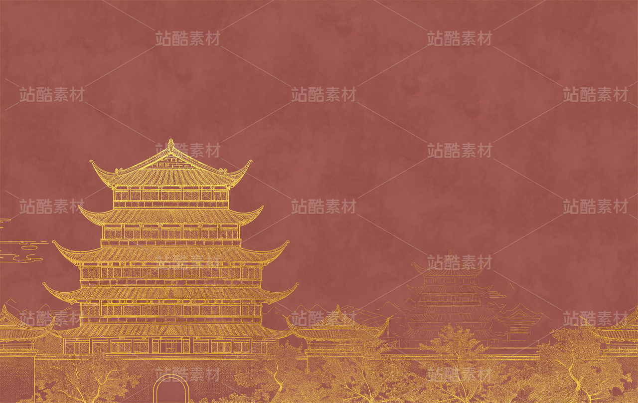 新中式国风亭台楼阁建筑工装背景墙壁画