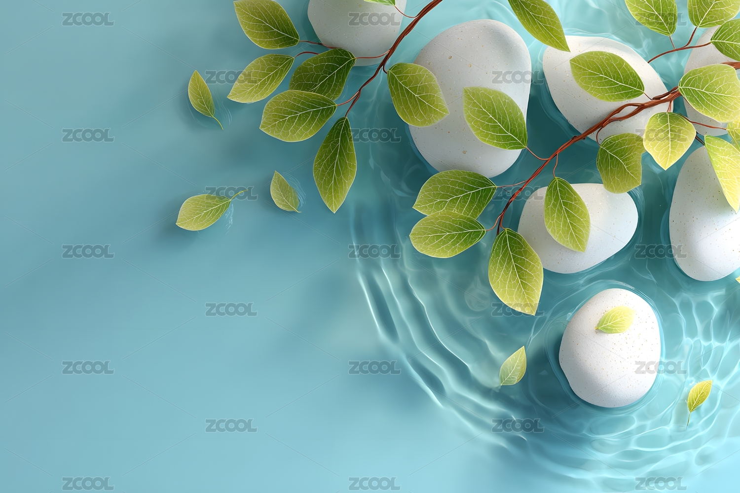 静谧石头与绿叶在水中绽放