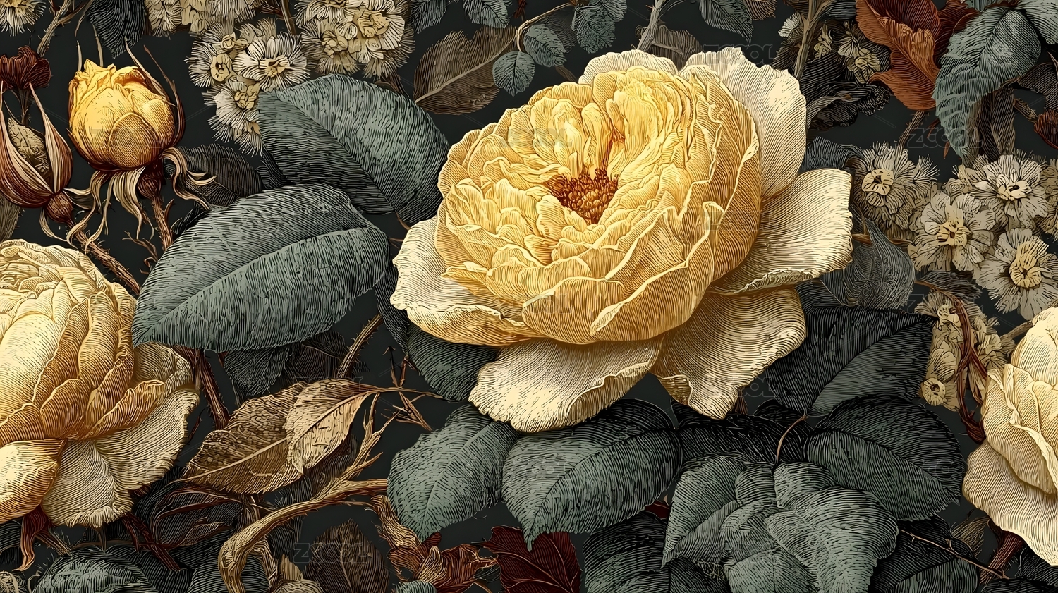 花朵,叶子,白色,黄色,图案,背景,复古,设计,细节,纹理