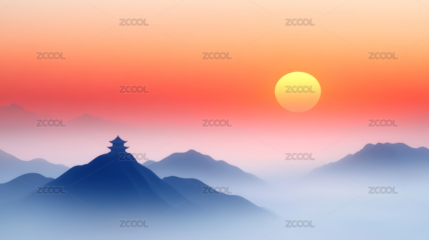 日出山峦寺庙图