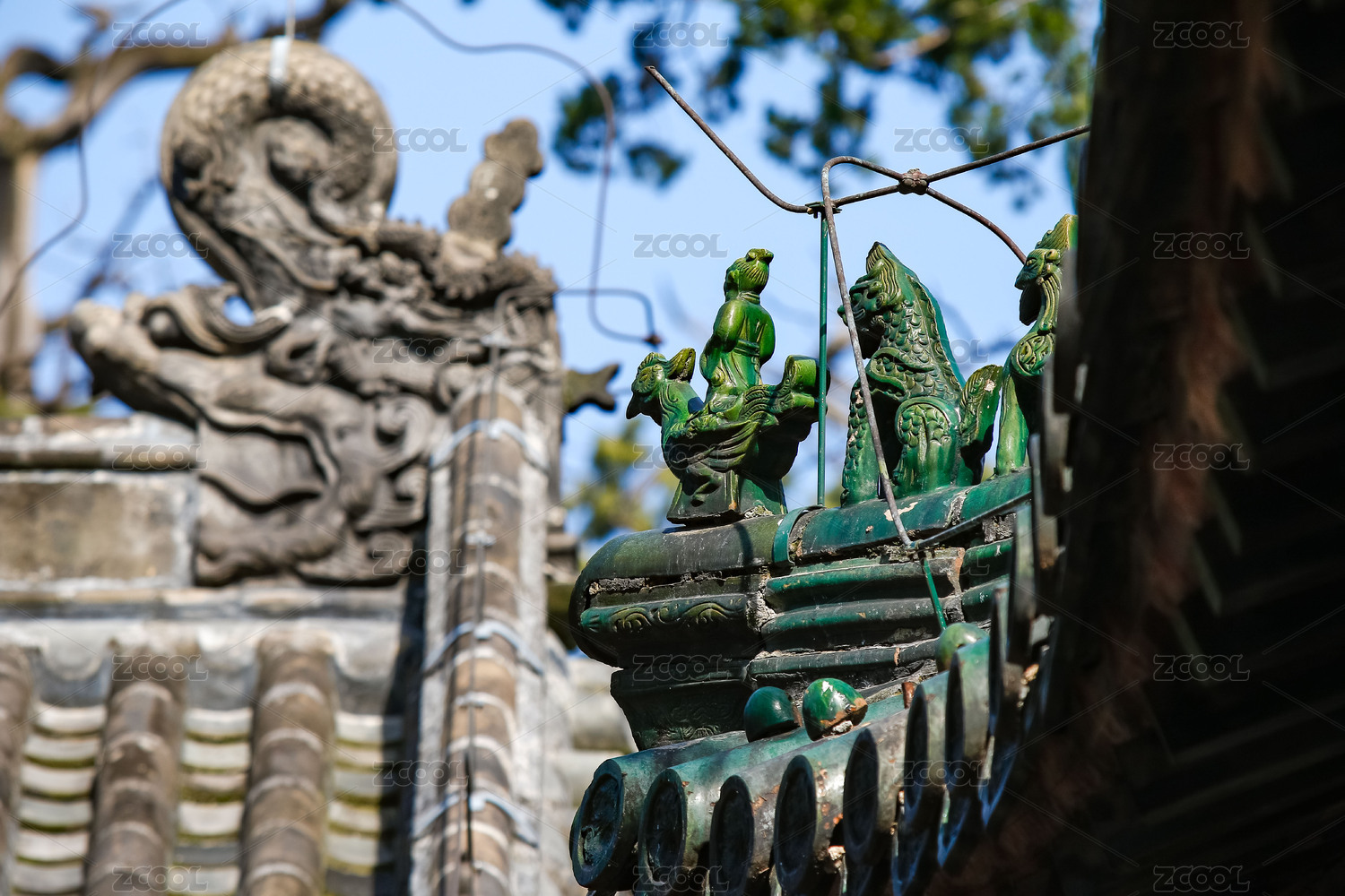 广东佛山祖庙传统建筑屋檐上雕刻的屋脊兽