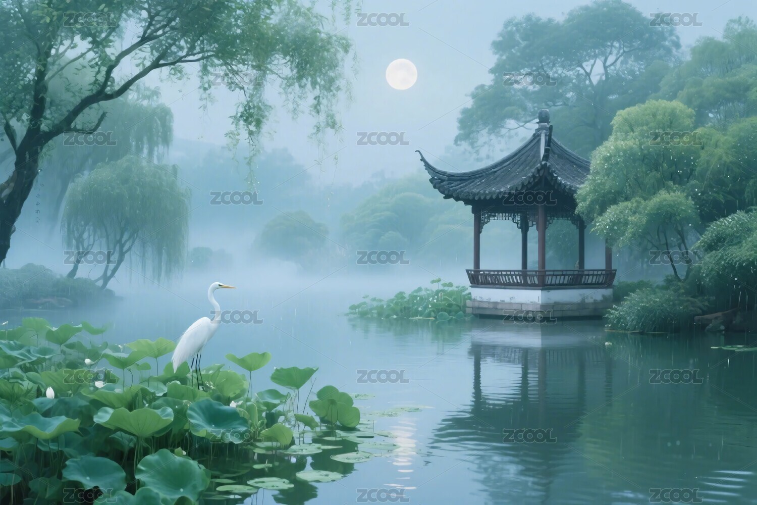 亭台,湖水,园林,古建筑,桥梁,流水,绿树,花草,风景,插画