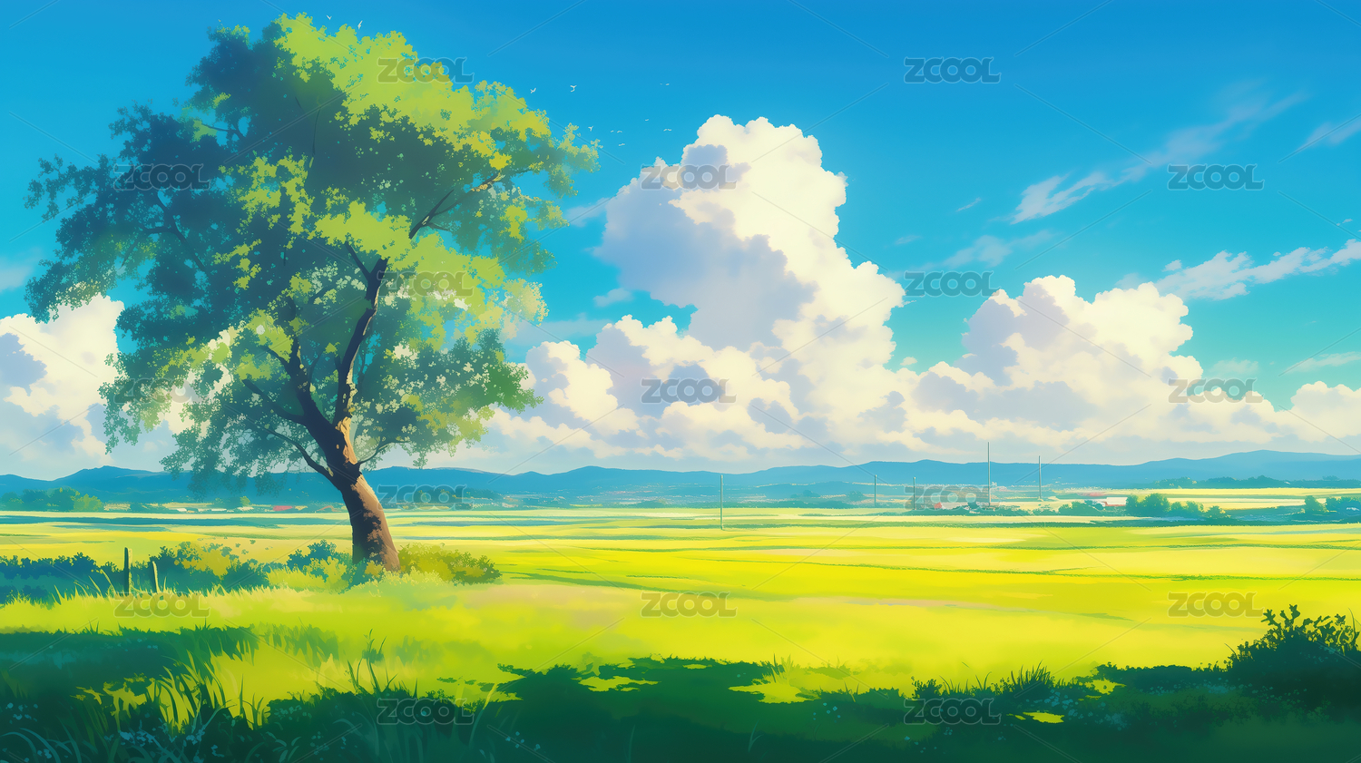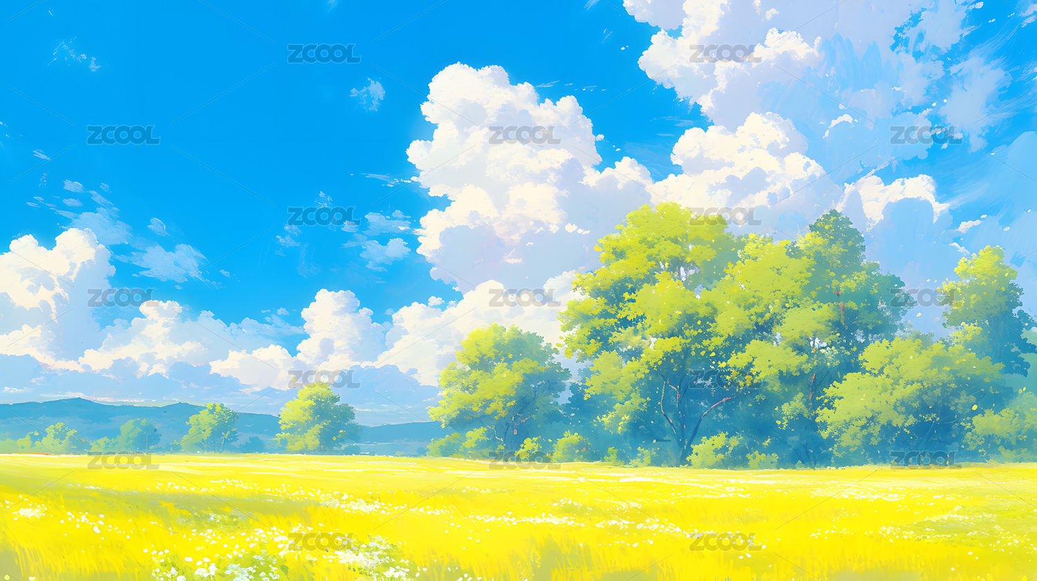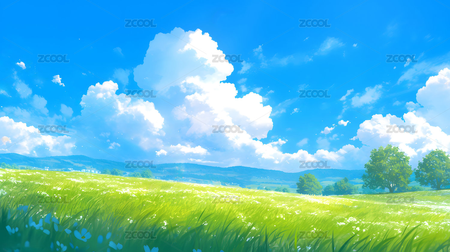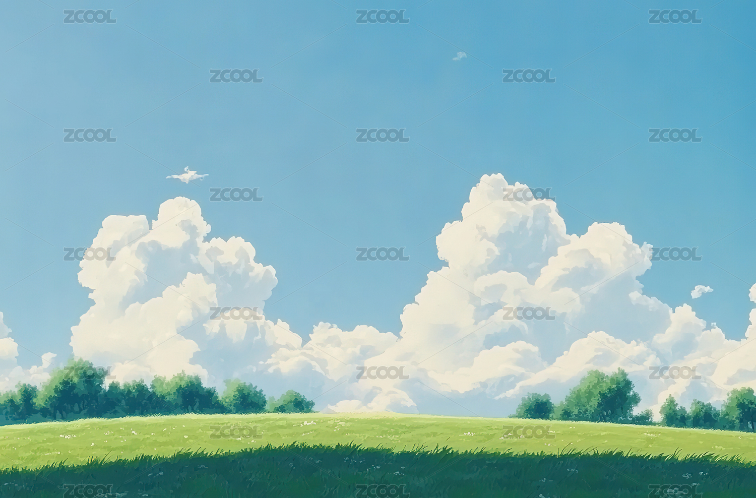 草地,蓝天,白云,森林,自然,风景,插画,背景,绿色,云朵