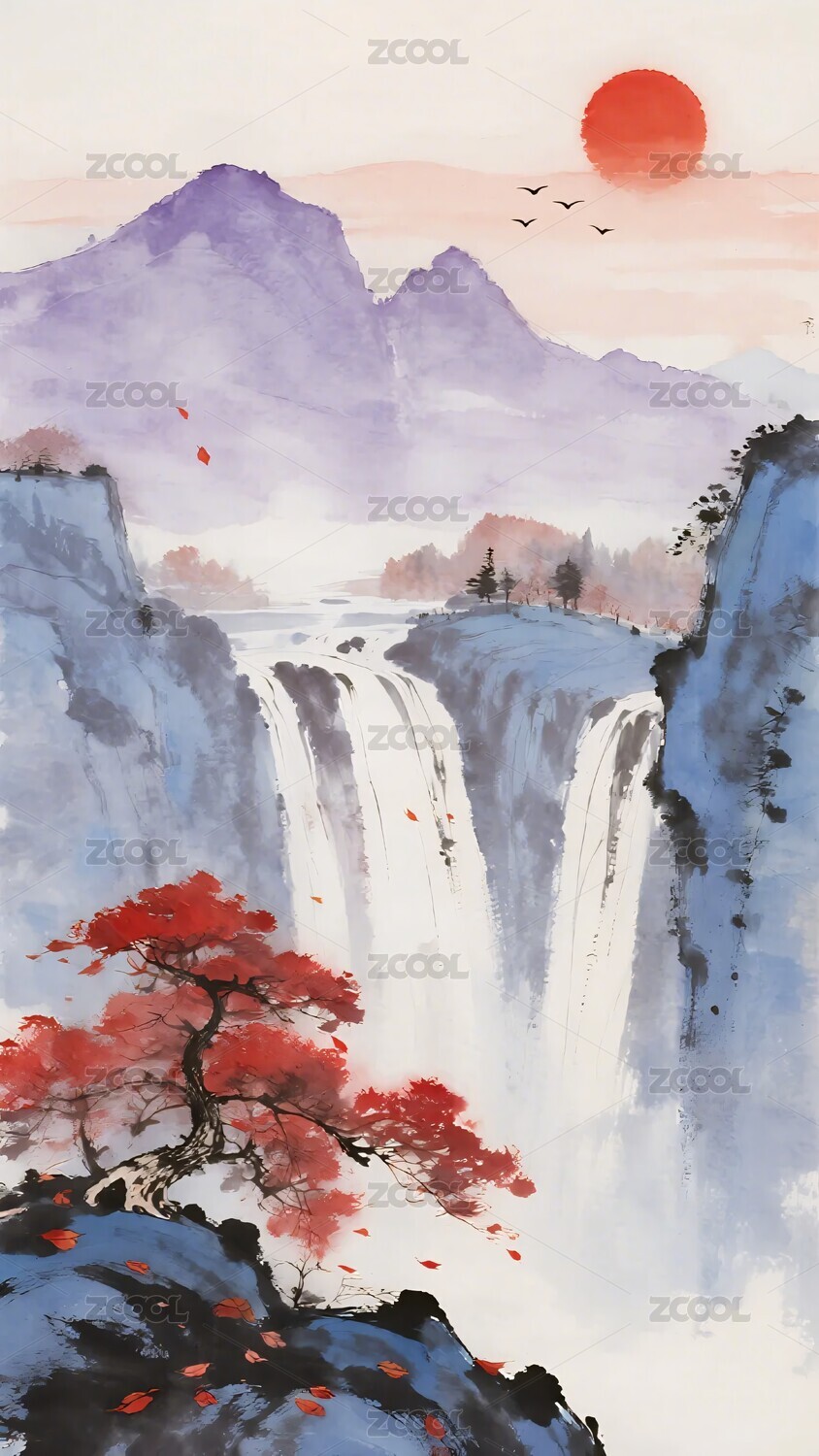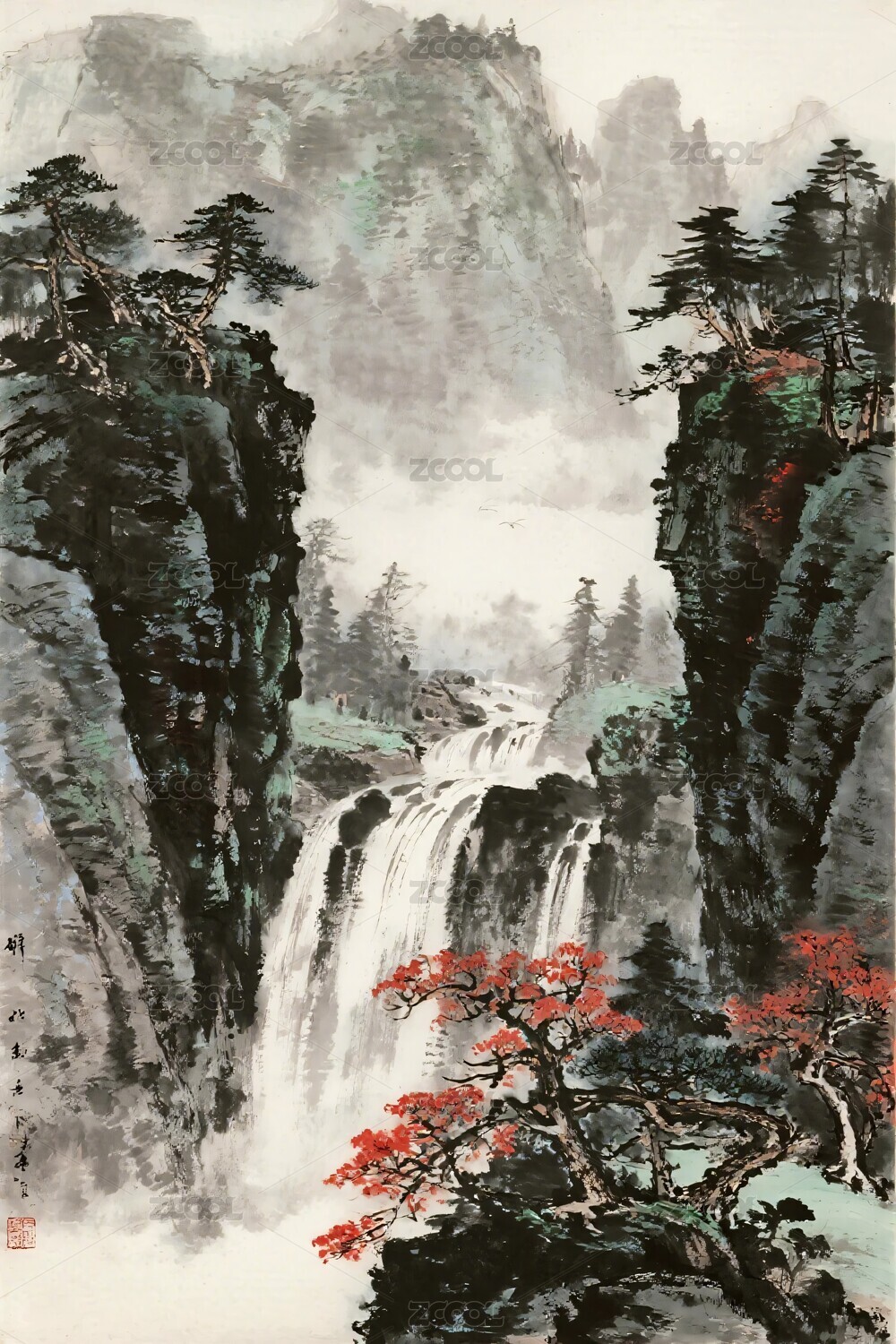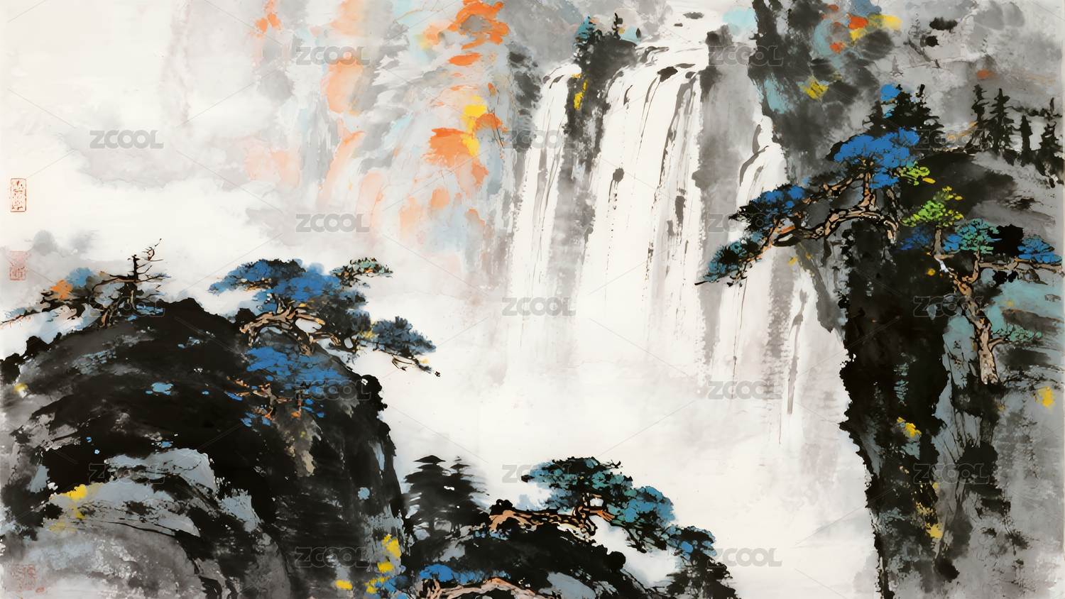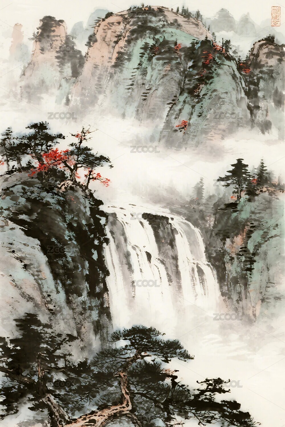 山水,瀑布,树木,水墨,山水画,国画,水墨画,山水景观,自然风景,插画