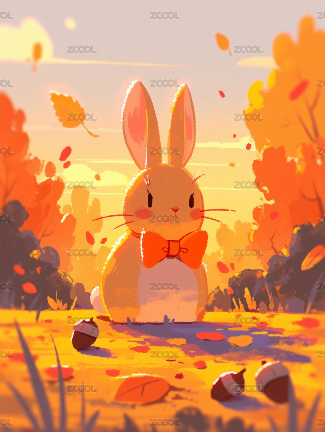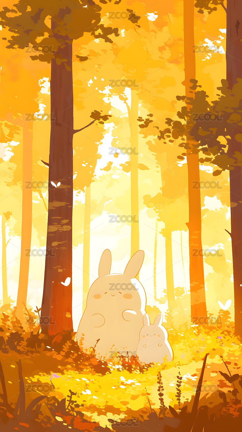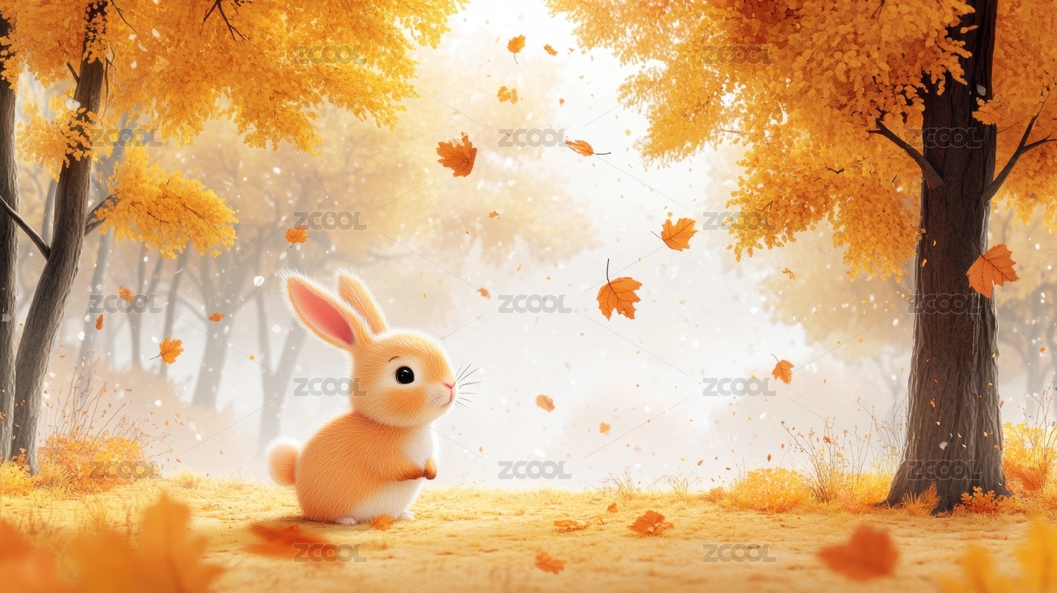 兔子,森林,秋天,落叶,插画,可爱,动物,自然,风景,光影