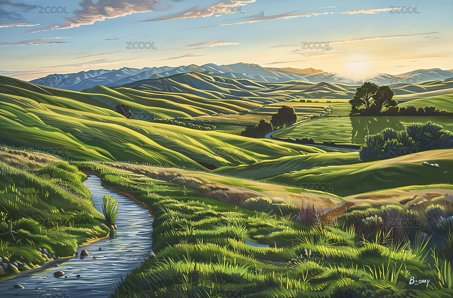山水,河流,山峦,森林,丘陵,绿色,自然,风景,插画,风景画