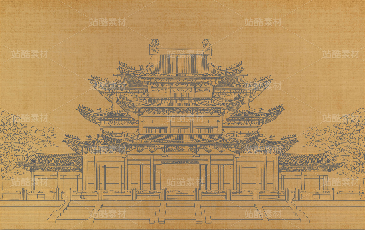 新款高清米黄布纹亭台楼阁新中式山水工装背景墙03