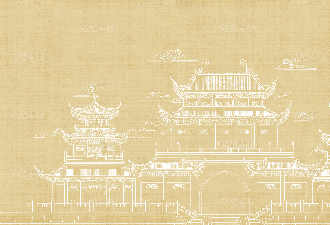 新款高清米黄布纹亭台楼阁新中式山水工装背景墙06