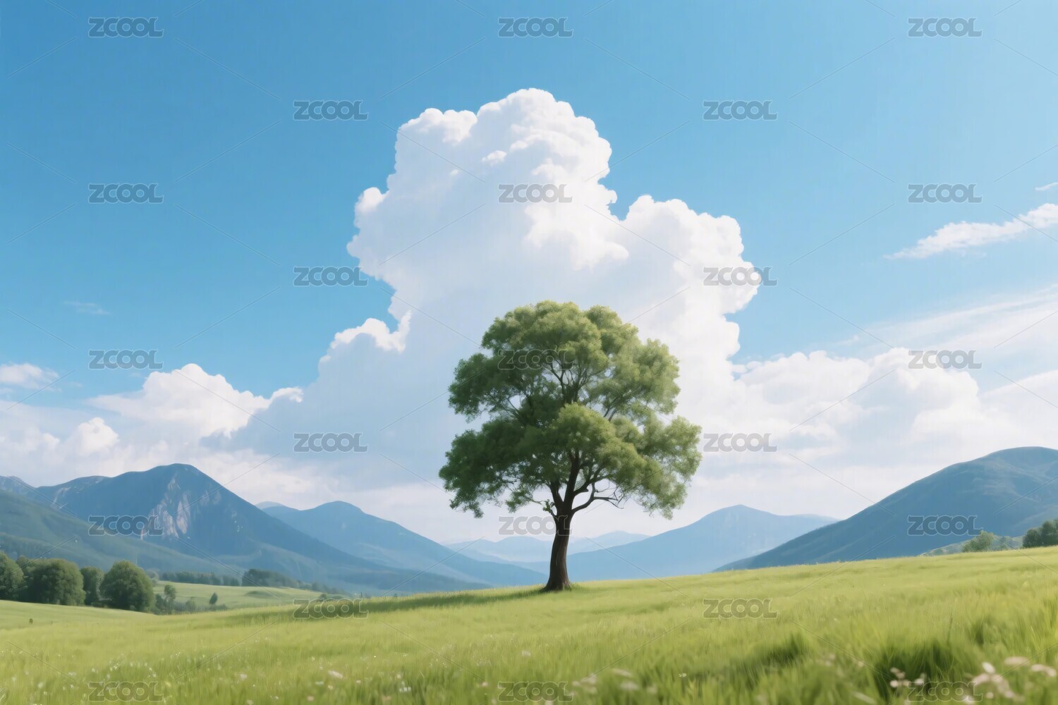 绿色大草原 蓝天白云 大树