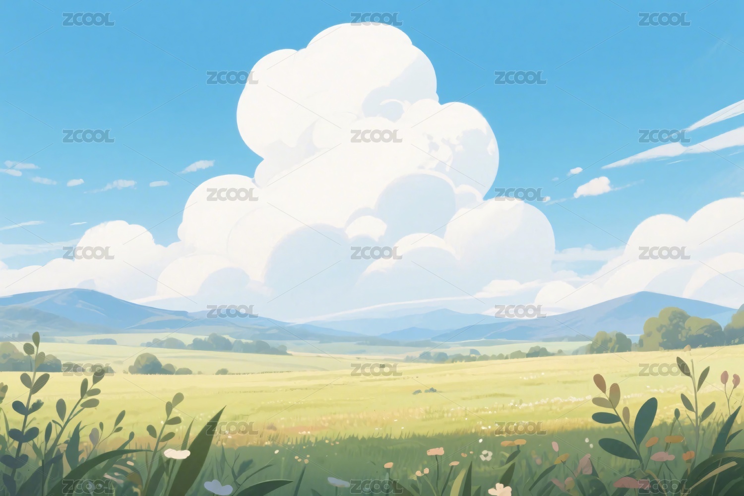 天空,草地,白云,插画,自然,风景,清新,宁静,草原,蓝天
