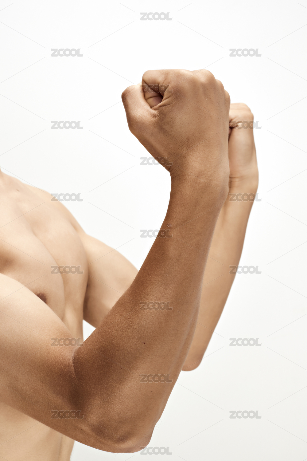 白色背景下展示胸肌肱二头肌的亚洲健身男性