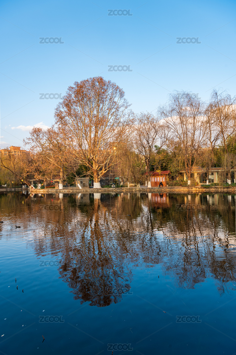 秋季黄昏时分中国昆明翠湖中的一颗树和倒影