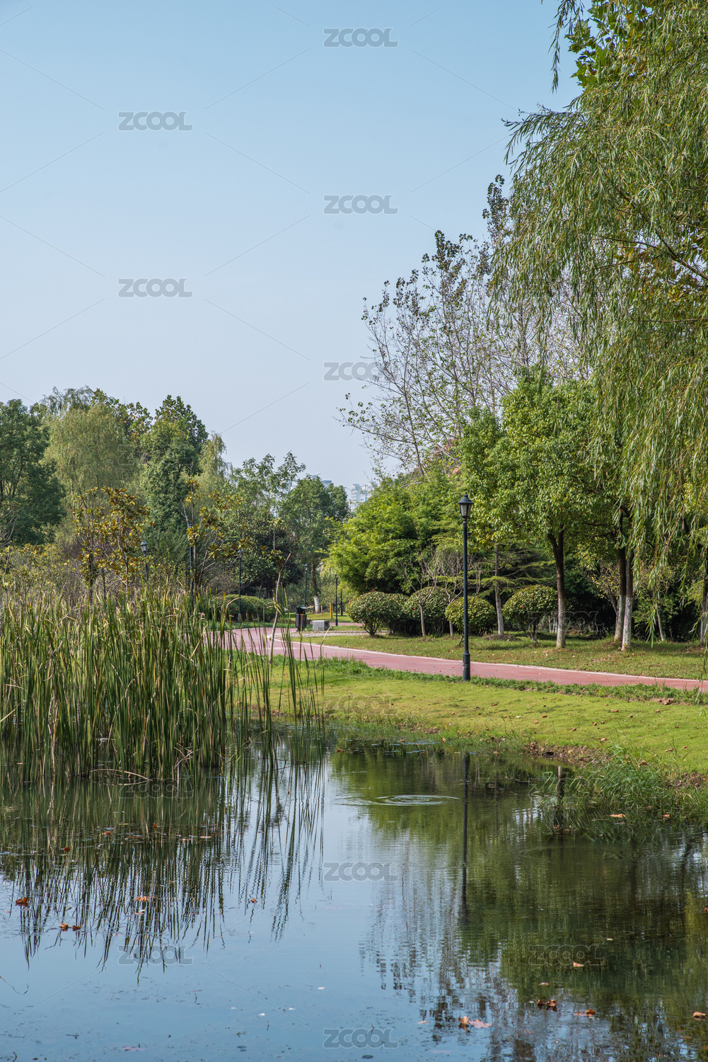 中国广州麓湖公园落羽杉红叶倒影湖面风光