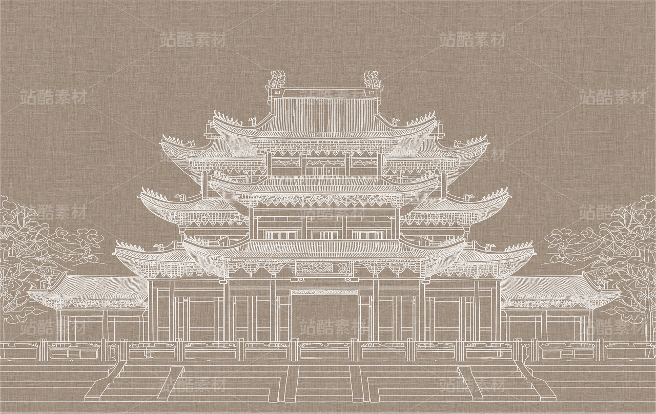 新中式国风亭台楼阁建筑工装背景墙壁画