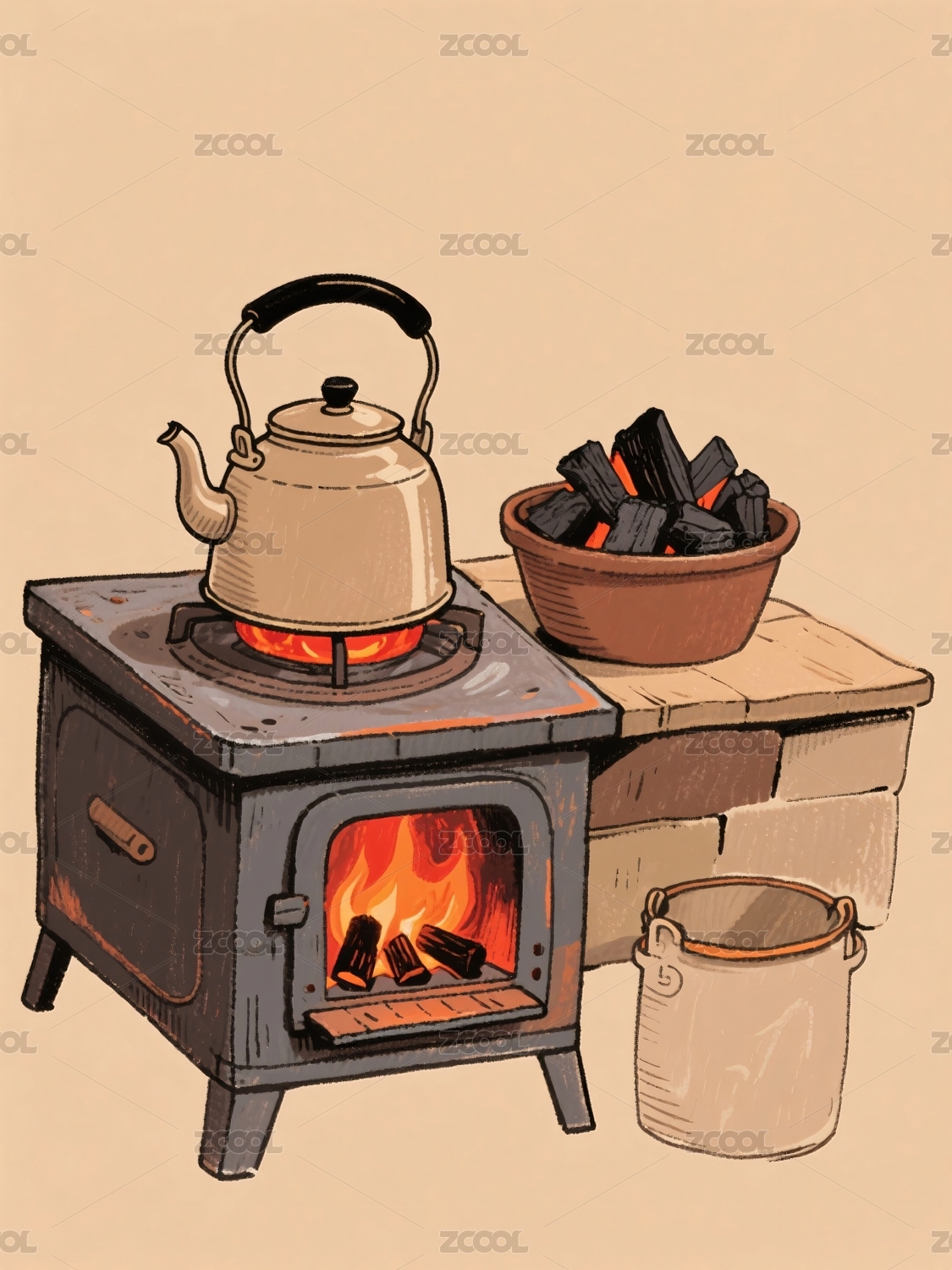 黑色,金属,圆形,橙色,底部,方形,水壶,木柴,冒烟,炉子