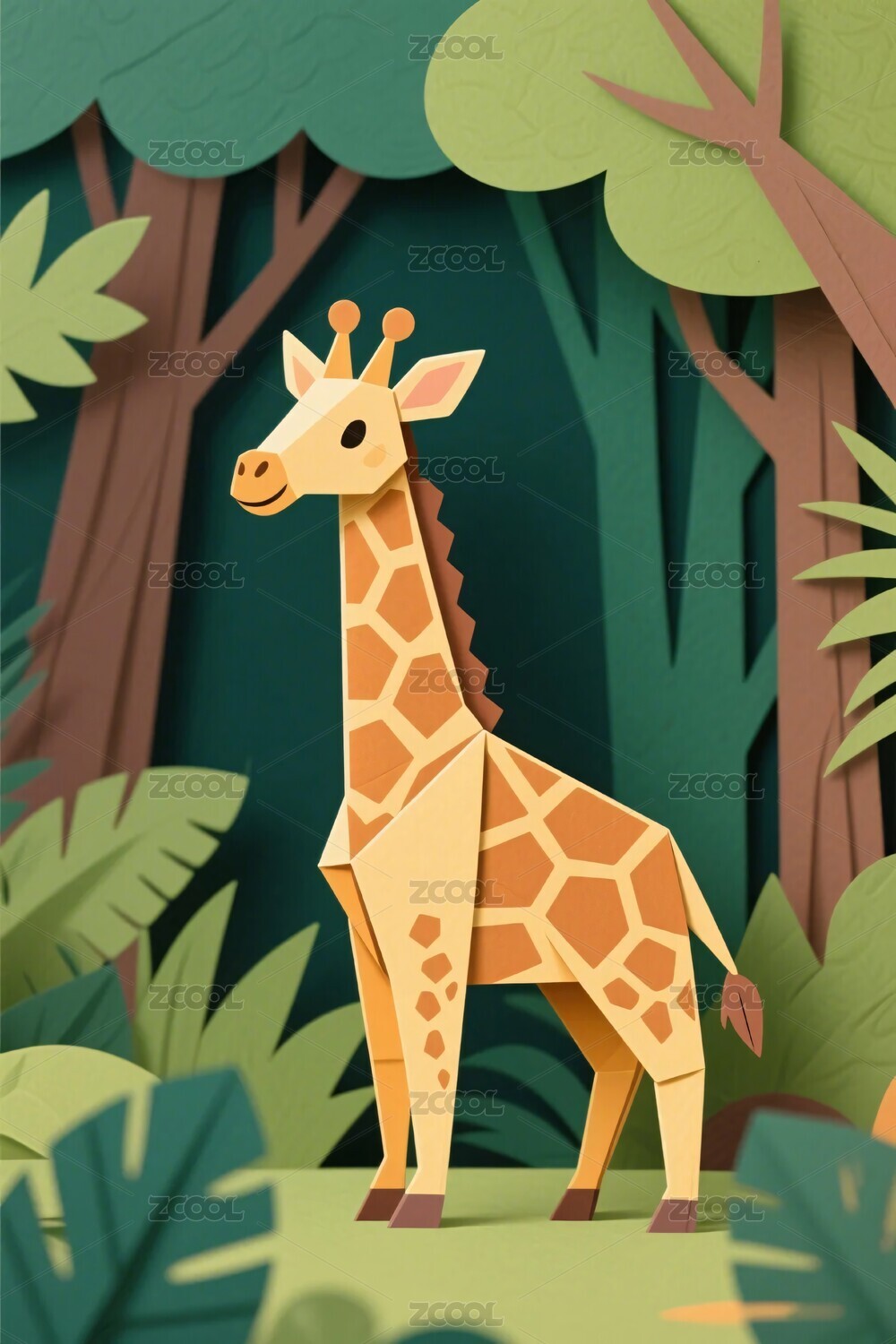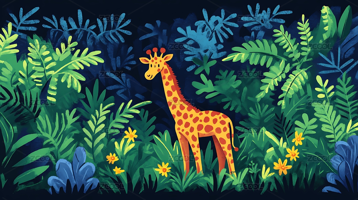 长颈鹿,丛林,树叶,插画,卡通,矢量,动物,森林,绿色,热带