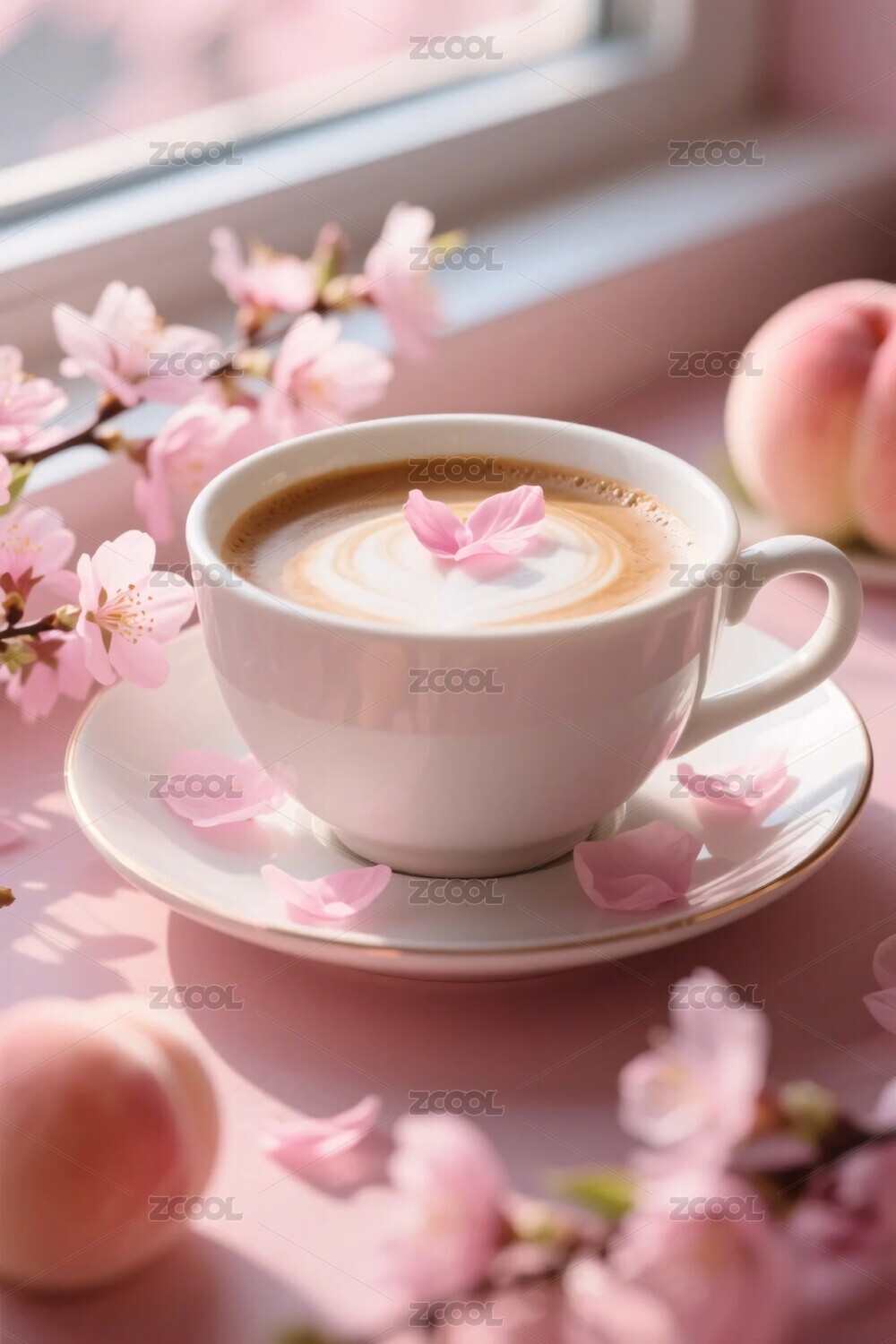 樱花,咖啡,杯子,花卉,饮品,春景,温馨,雅致,插画,春日