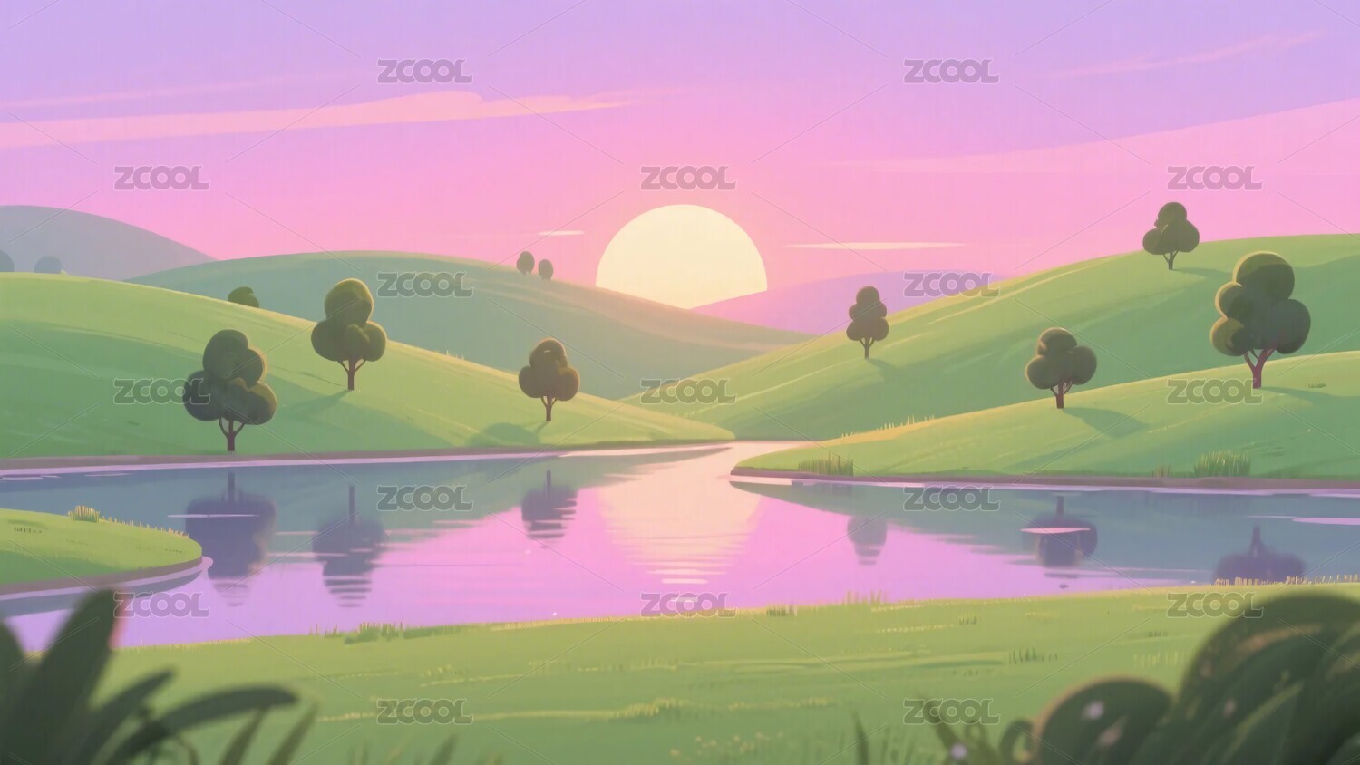 湖泊山丘日落插画