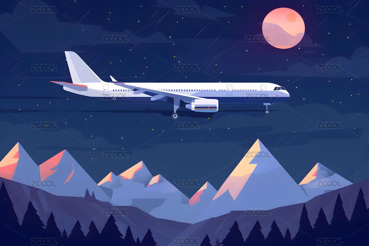夜空飞机飞过山脉